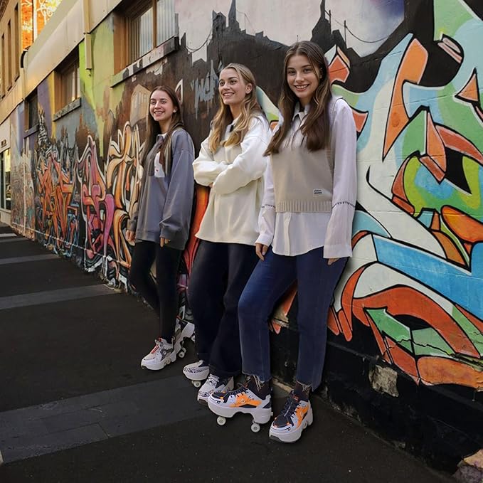 - Transformative Design: Say goodbye to carrying around bulky roller skate shoes! Experience the thrill of skating and the comfort of sneakers like never before with our innovative 2-in-1 Roller Skates and Sneakers! Designed for both style and functionality, these incredible shoes seamlessly transform from trendy everyday sneakers to sleek 4 wheel roller skate shoes with hidden wheels, giving you the freedom to switch between walking and rolling.