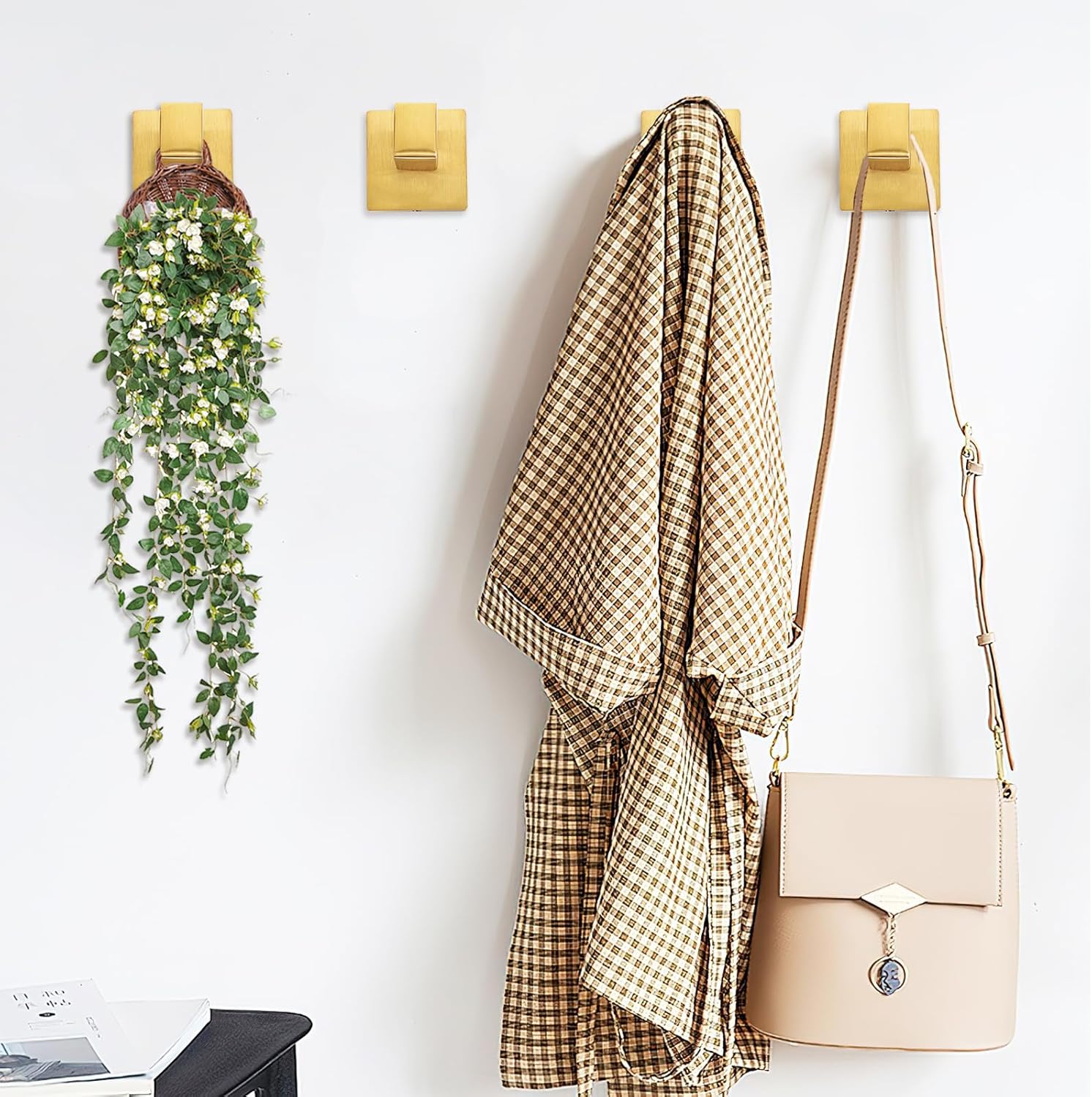 IBosins 4 Pack Towel Hooks Hand Towel Holder for Bathroom Wall Livingroom Bedroom Kitchen Closet Heavy Duty Stainless Steel Hook Hanger for Robe, Bath Towel, Coat (Square Brushed Gold)