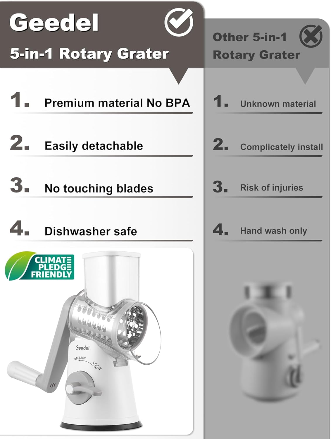 Geedel Rotary Cheese Grater Cheese Shredder - Upgraded 5-in-1 Cheese Grater with Handle and Strong Suction Base, Multi-purpose Vegetable Slicer Ice Shaver Nuts Grinder for Ice, Vegetables, Fruit, Nuts