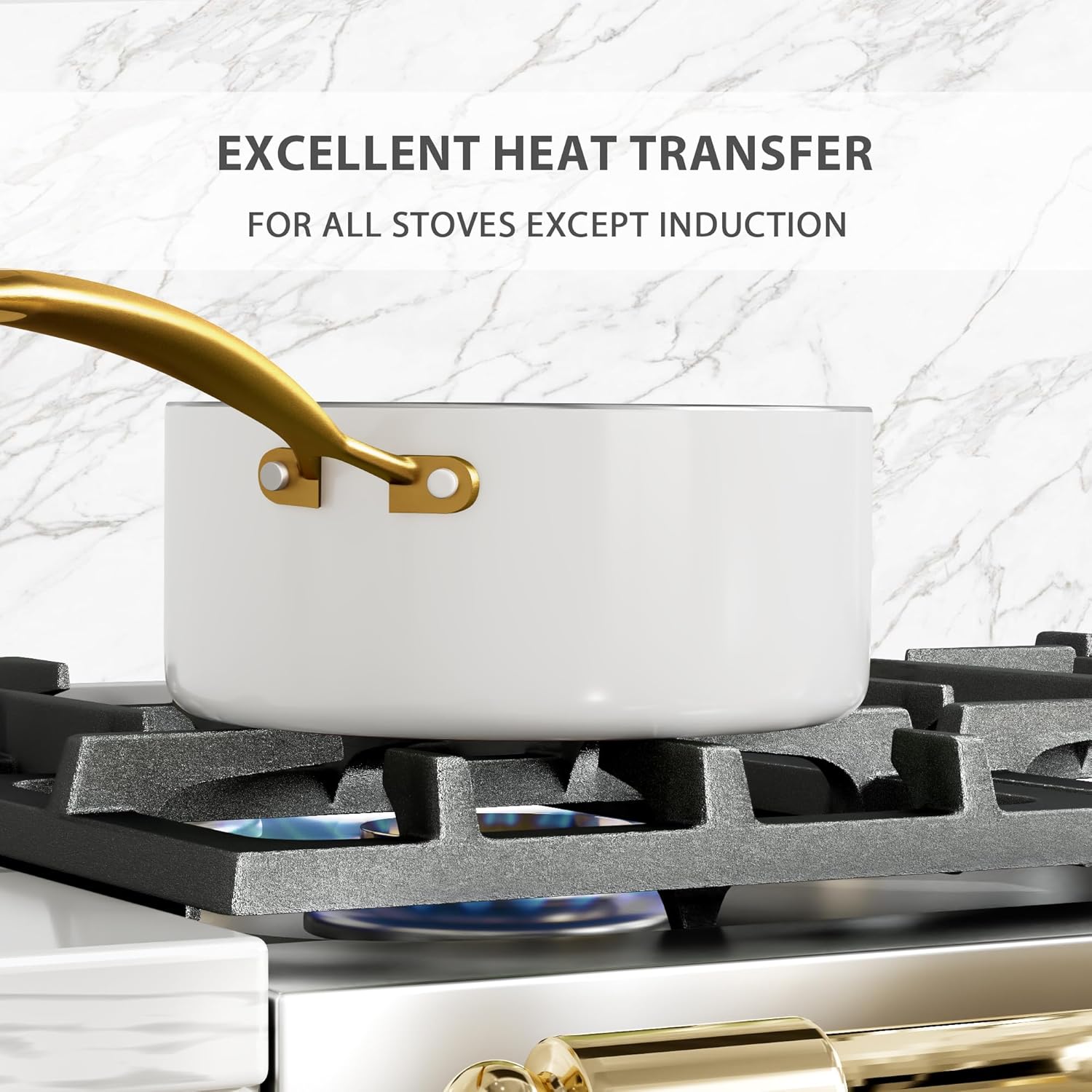 - 【For all Stovetops Except Induction】- The nonstick cookware set does not have a magnetic induction bottom, which allows faster heating on other cooktops, saving time and energy. Oven safe up to 550°F.
