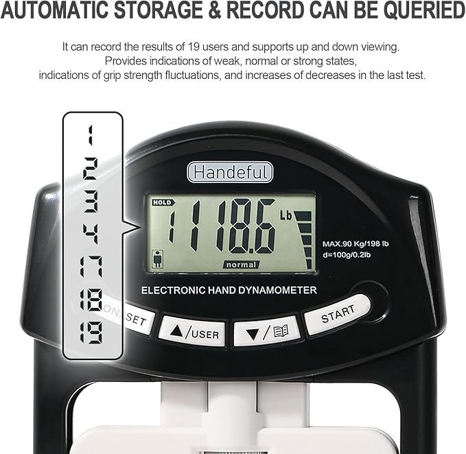 Handeful Grip Strength Tester Trainer - Dynamometer Handgrip Measurer Meter, Handheld Strengthener Exerciser for Sports, School, and Home Use (198Lbs / 90Kgs)
