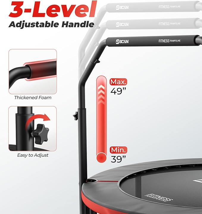- 3-Level Adjustable Handle: Handle height available from 39'' to 49''. BCAN Rebounder Trampoline for Adults can be adjusted to the height range of the whole family, ensuring that you can hold the handlebar in the most comfortable position when jumping