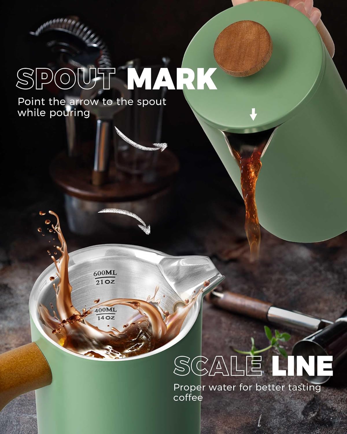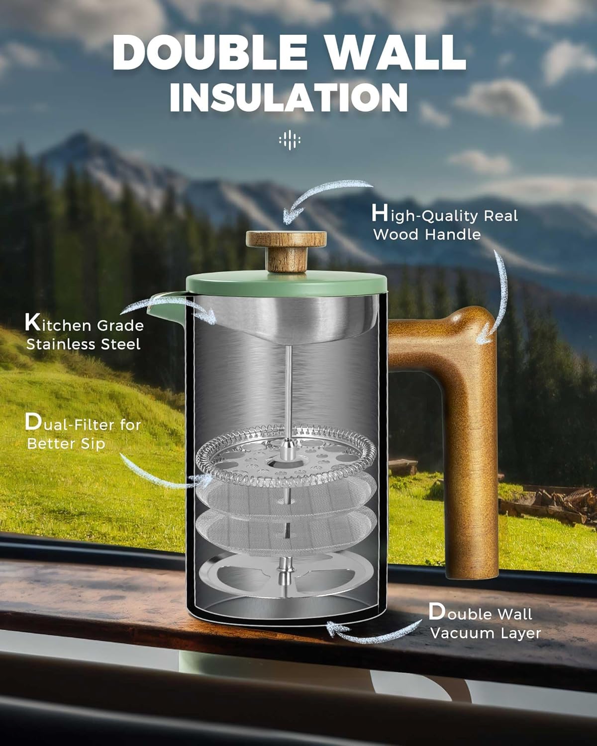POLIVIAR French Press Coffee Maker, 21 oz Coffee Press with Real Wood Handle, Double Wall Insulation & Dual-Filter Screen, Food Grade Stainless Steel for Good Coffe and Tea, JX2024-SFPN