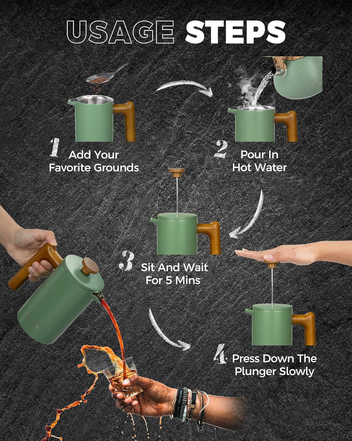 - EXQUISITE COLOURS & REAL WOOD HANDLE: Featuring a long-lasting, scratch-resistant exterior paint and a real wood handle, the french press cofffee maker boasts a vintage look that decorates every corner of your home and enhances your quality of life.