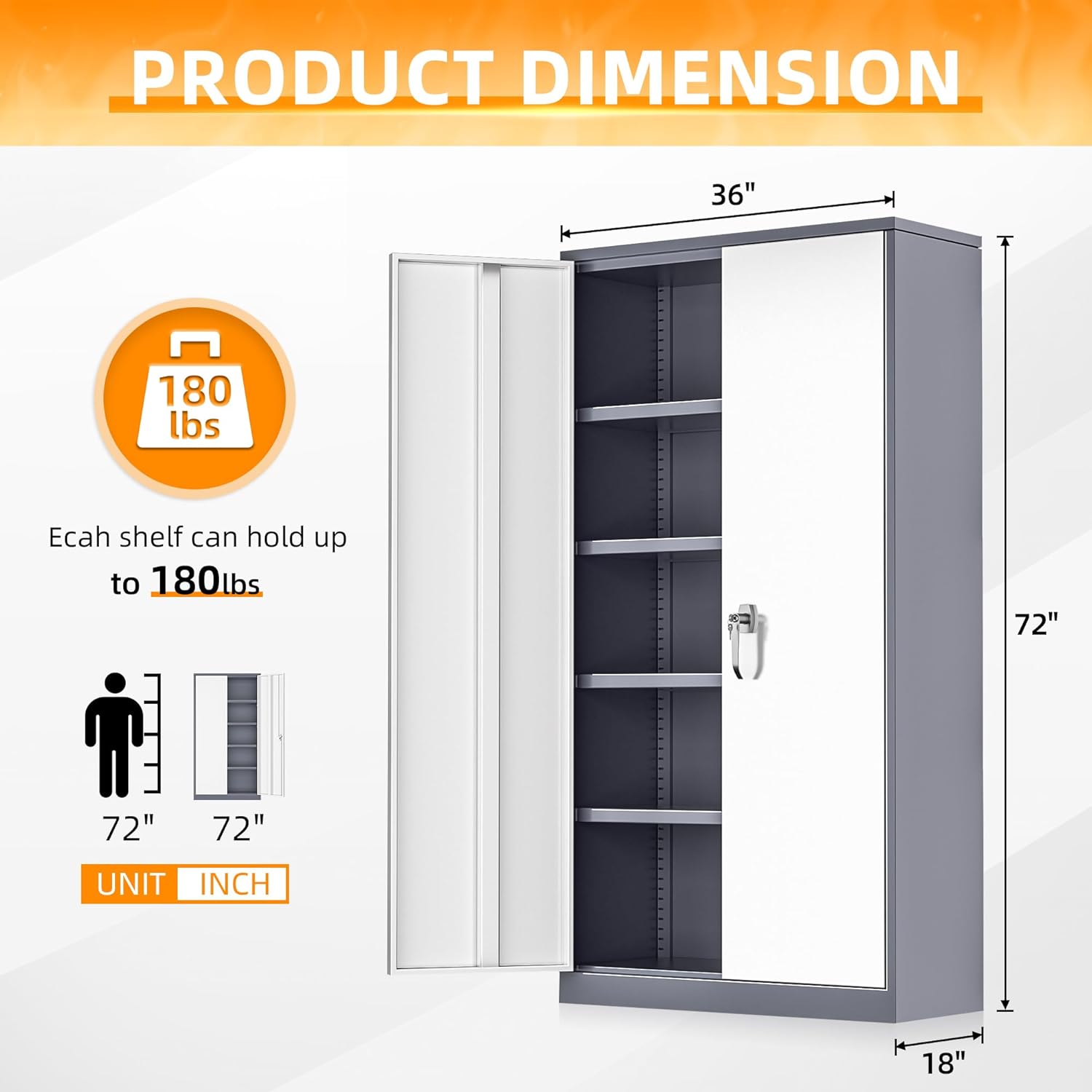 - 【Large Storage Capacity】: The size of the metal storage cabinet is 72 H × 36" W × 18" D. With 4 adjustable shelves, the steel cabinet is divided into 5 layers, with larger storage space suitable for storing office papers, garage tools and household items.