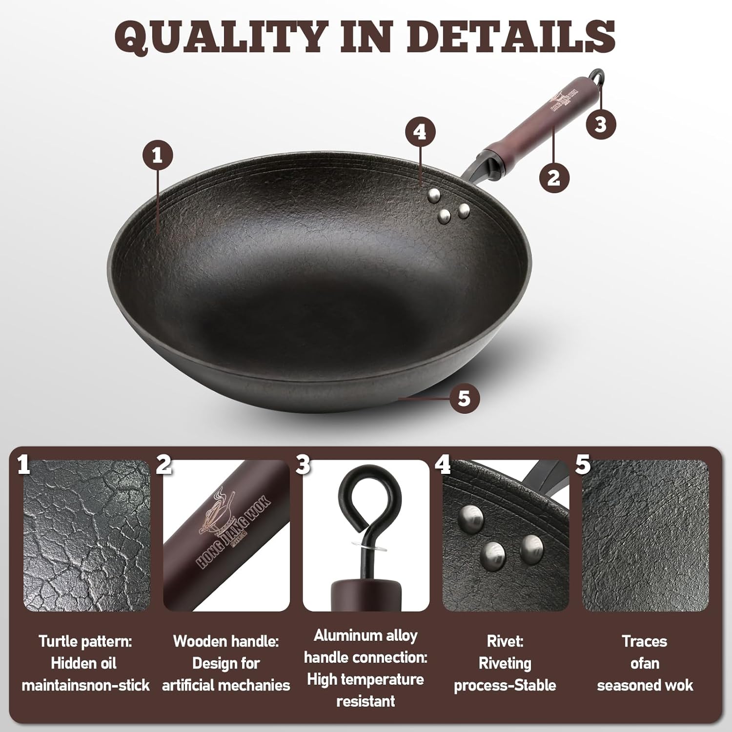 - 【Ancient Craftsmanship】Our cast iron wok have a unique pattern - "turtle shell texture”, which is traditionally hand-poured and naturally formed by iron, and cannot be imitated by machines. When the oil is put into the wok, a film of oil is formed on the surface along the tortoise pattern to wrap around the ingredients and achieve the physical non-stick effect.