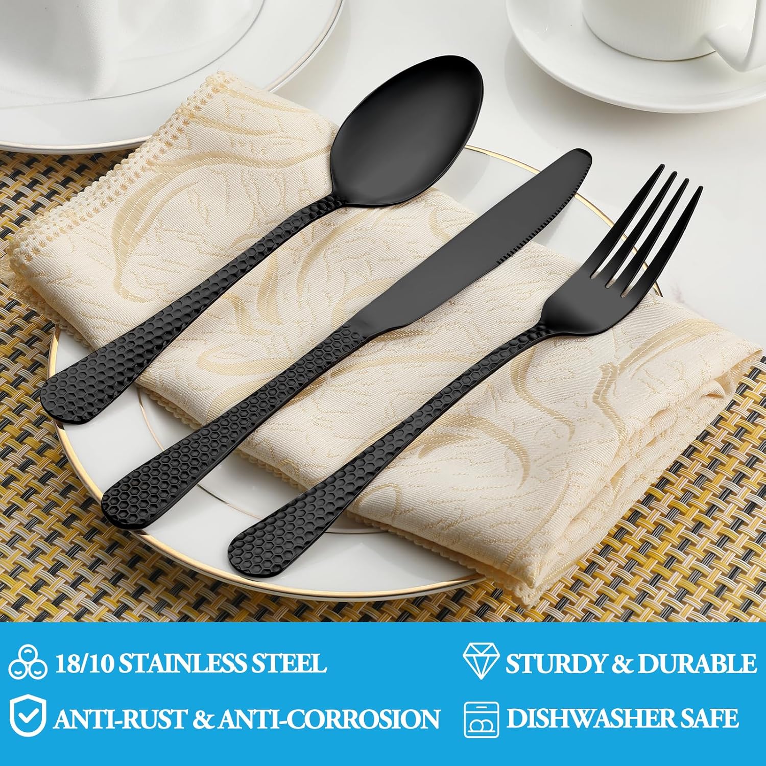 - PREMIUM STAINLESS STEEL: This black hammered flatware set is made of high quality food grade stainless steel which is very durable, rust-proof, corrosion resistant, non-toxic, BPA free, no metal aftertaste. Meanwhile, its sturdiness ensures that it will not bend easily providing you with long - term use. Most importantly, they’re dishwasher safe.