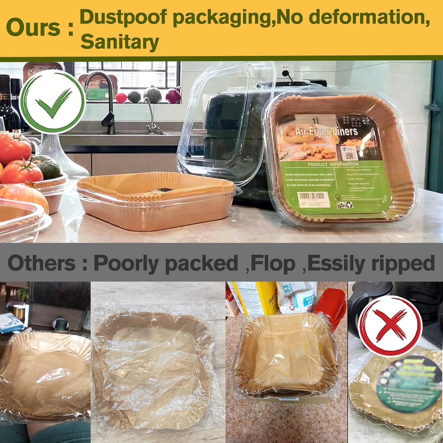 - 【Easy to Use】The small air fryer parchment paper liner for most small air fryer are designed with a square bowl shape, which do not need to tear, fold, cut, nor bend, and you can directly put it in when you are ready to cook. Its heightened edge 4.5cm can protect the side of fryers and prevent food from sticking to them.