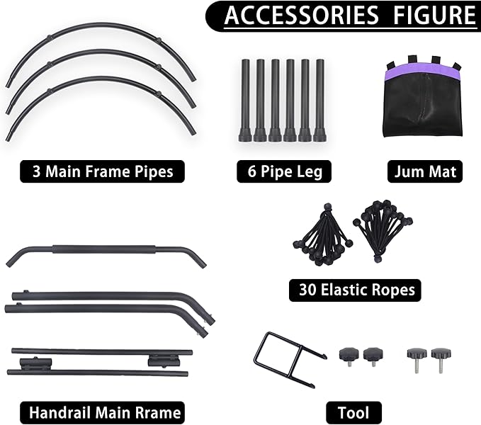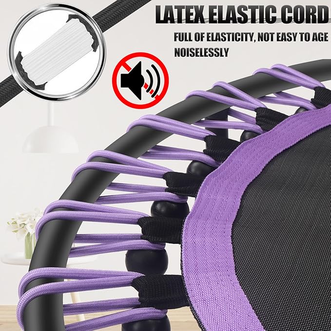 - ✅【Good Elasticity】:The bungee-rope design system with 30 thickened ropes which are 0.32"(8MM) of diameter provides joint-friendly suspension,soft but strong bounce back, provides silent and safely bounce back, reduces noise in maximum extent, affords more stability, and gives you a great jumping experience. Special tool is included for assembly.
