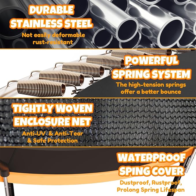 - 【Durable Structure】Our outdoor trampolines feature galvanized stainless steel frames for durability, weather resistance, and rust prevention. Supported by five evenly spaced W-shaped legs, our heavy duty trampoline provides optimal stability and support.