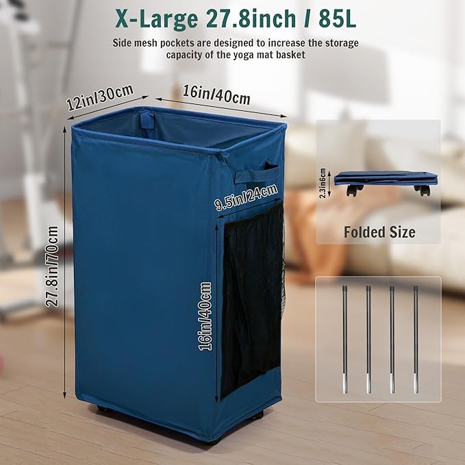 - WIDENED SIZE: Upgraded yoga mat basket with 85L capacity measures 16"(L) x 12"(W) x 27.8"(H) / 41x30x70CM can easily accommodate 4 different sizes of yoga mats, 2 foam rollers, as well as kettlebells, yoga bricks and more