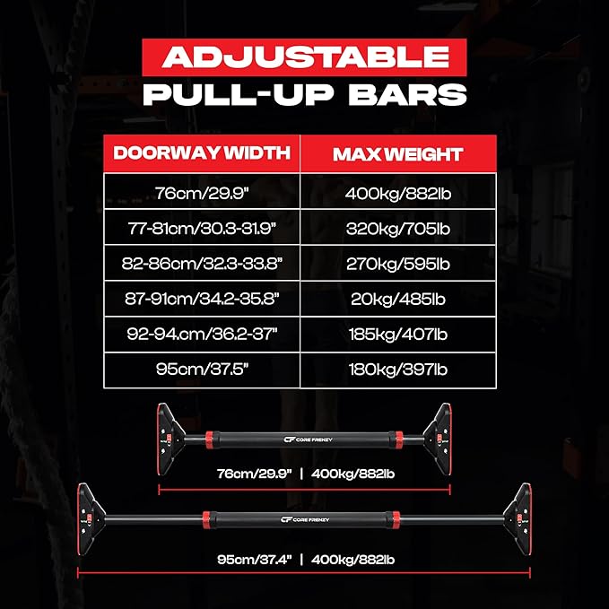 - ๐ง ADJUSTABLE & UNIVERSAL FIT: Designed to fit most door frames, the Core Frenzy Pull-Up Bar extends from a compact 29.9" to an extra-wide 37.5". Whether you're doing chin-ups or wide-grip pull-ups, this bar adjusts to your spaceโno tools or screws required.