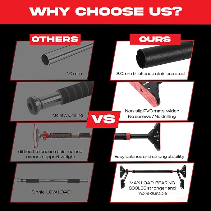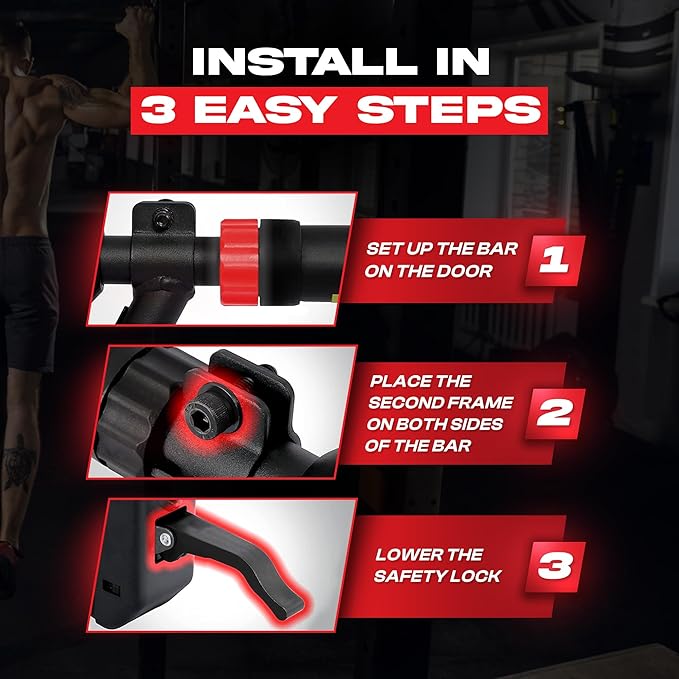 - โ EFFORTLESS INSTALLATION: Transform your home into a gym in seconds with the Core Frenzy Pull-Up Bar for doorway โno screws, no drilling, no damage. Just twist and lock into place for a rock-solid grip. Ideal for doorway pull up workouts or as a chin up bar with no wall damage solution.