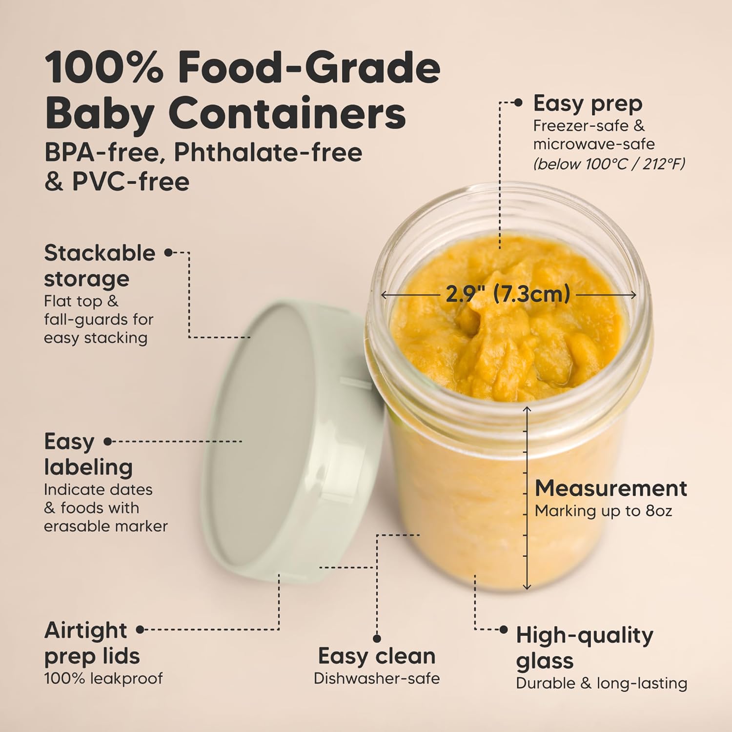KeaBabies 4pk 8oz Glass Baby Food Containers with Lids - Leak-Proof, Microwavable Small Glass Jars, Baby Purees & Toddler Snack Storage Containers, BPA-Free, Dishwasher & Freezer Safe (Sage)