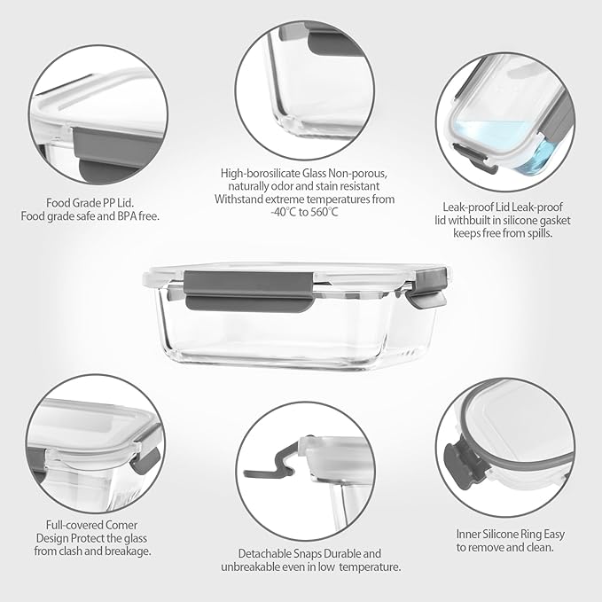 - Bpa-free & Lead-free & High-borosilicate glass & Easy to Open and Close & Easy to clean- The Glass Storage Containers are BPA Free, and made out of high-borosilicate glass for easy heating and durability. non-porous glass, Free of Harmful Chemicals.