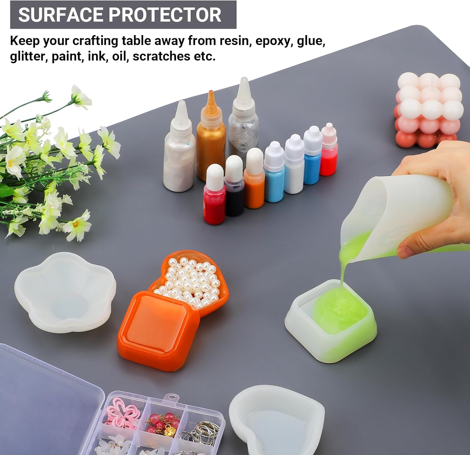 - WIDELY APPLICATION - The anti-slip pad is used for art & crafts projects (soaps/candles/wax making), glue up wood projects, epoxy resin, jewelry making, nail art, beadwork, clay/play the dough, pour film, tumbler, 3d projects, card making, scrapbooking, puzzles, sewing, gardening, furniture surface protection, trivet, drains, dining tables, dough, pet feeding. It can also be used as countertop protector, waterproof barrier, laptop computer mat, coasters, tray mat, heat insulated pads, etc.