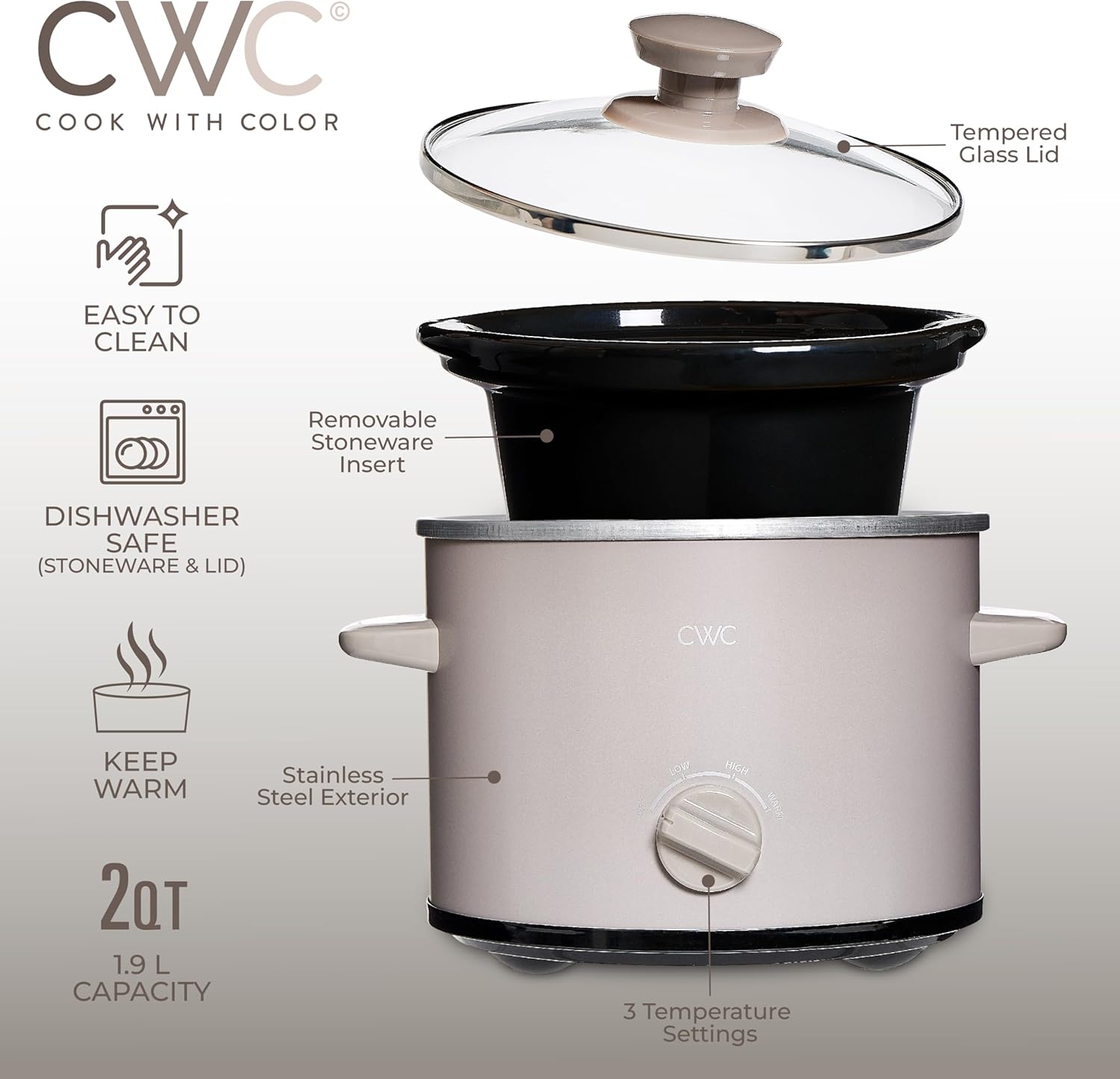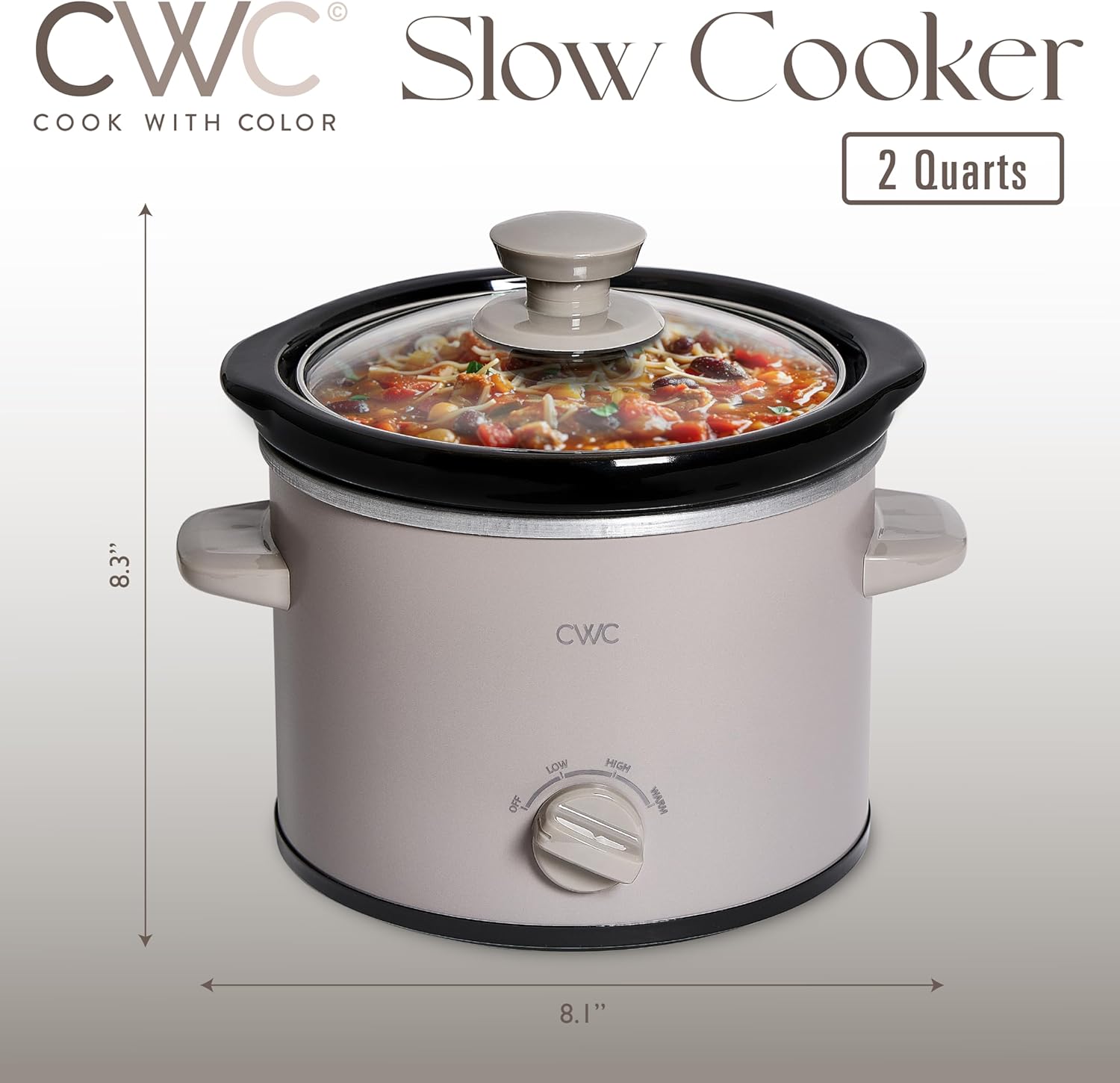 COOK WITH COLOR 2QT Mini Electric Round Slow Cooker - Adjustable Settings, Removable Stoneware Pot, Tempered Glass Lid, Dishwasher Safe, Cool-Touch Side Handles, Greige