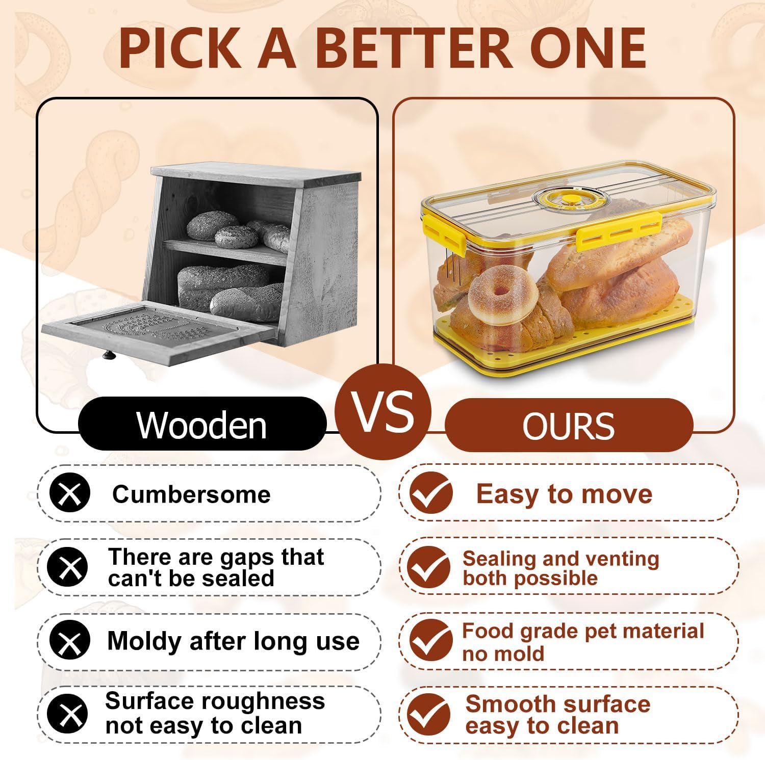 - Why choose our bread box: Compared with the long strip shape bread container,our bread storage box is wide and suitable for putting different shapes of bread.Compared to the wooden breadbox,our bread storage container is easy to clean and the material of the bread keeper box will not get moldy after years.Our bread bin is sealed for resistant to moisture.Have an air valve on the bread box lid,optionally release hot bread airflow or seal against moisture