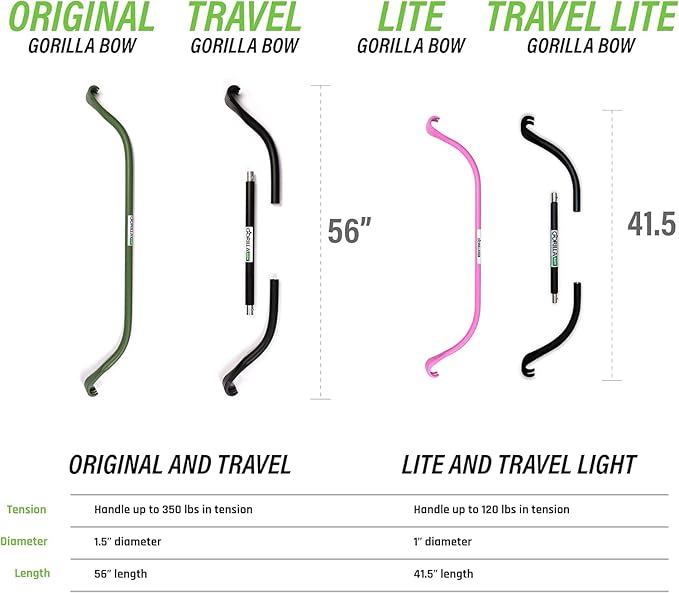 - Compact and Portable: Stay fit wherever you are with the Lite Gorilla Bow. Measuring just 41.5 inches, it's compact and portable, ideal for travel or small spaces. Maintain your fitness routine on the go without sacrificing workout intensity.
