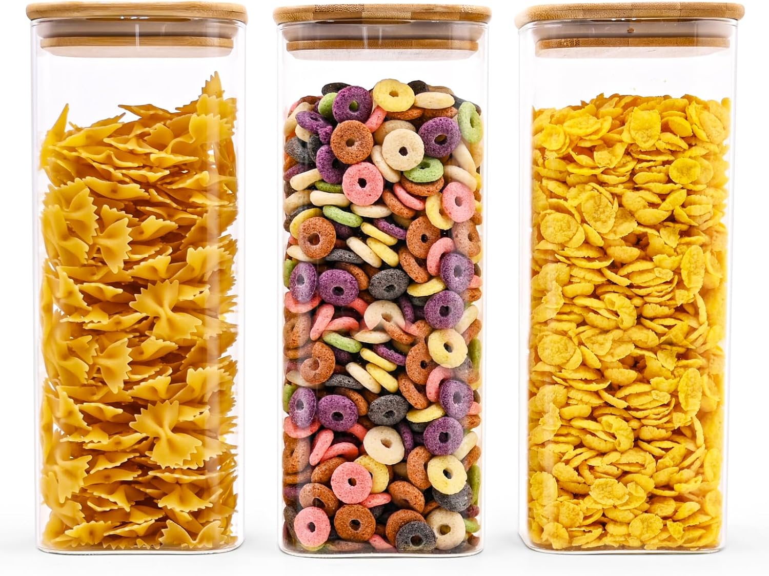 - [Premium quality and safety assurance] Our glass containers with bamboo lids are made of premium quality and borosilicate glass, glass pantry storage containers can withstand the harsh tests of daily use. The bamboo lid provides an airtight seal, ensuring the freshness of stored food. Our glass food storage jars are BPA Free, Phthalate Free, PVC Free, Lead Free, They are healthy and reliable choice for your kitchen.