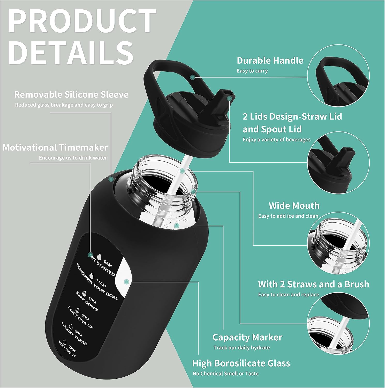- HALF GALLON CAPACITY WATER BOTTLE: Large water bottle ensures you enjoy enough water without having to refill it frequently. It's perfect for an on-the-go lifestyle! 32 oz, 40oz, 64 oz capacity glass water bottles that meet your different hydrating need