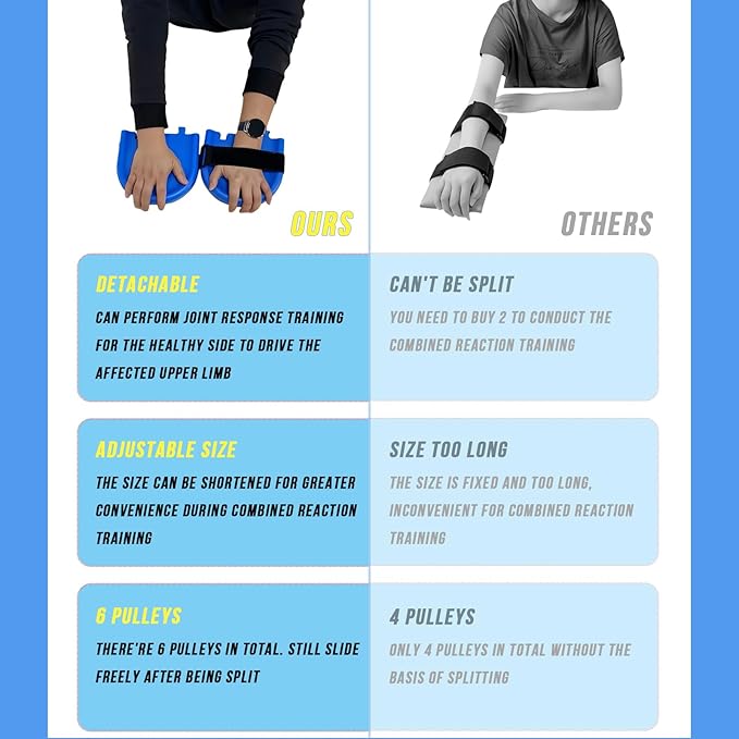 - 【Enhanced Function】This item consists of 2 symmetrical parts that can be closely joined together, with 6 pulleys that can rotate 360° and 2 Velcro straps. No matter what your muscle level is, you can carry out rehabilitation training. When disassembled, each part contains 3 wheels and 1 Velcro strap. You can put it on your hand to conduct the combined reaction practice of the healthy and affected upper limbs. This enables you to recover more easily and quickly than only exercising 1 upper limb