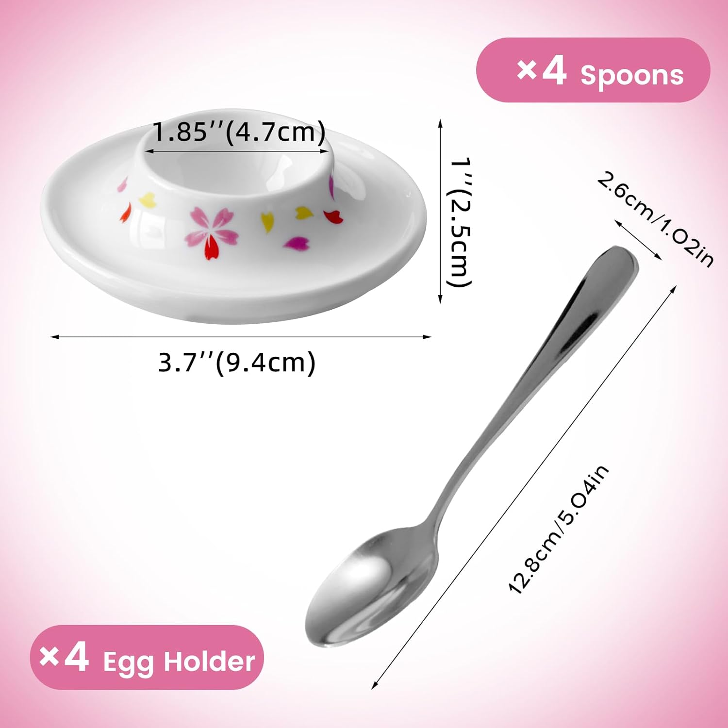 Cinf Ceramic Sakura Egg Holder Set of 4 Porcelain Holder With 4Stainless Steels Egg Spoons Breakfast Boiled Cooking Easy to Clean Childhood Memories Kitchen