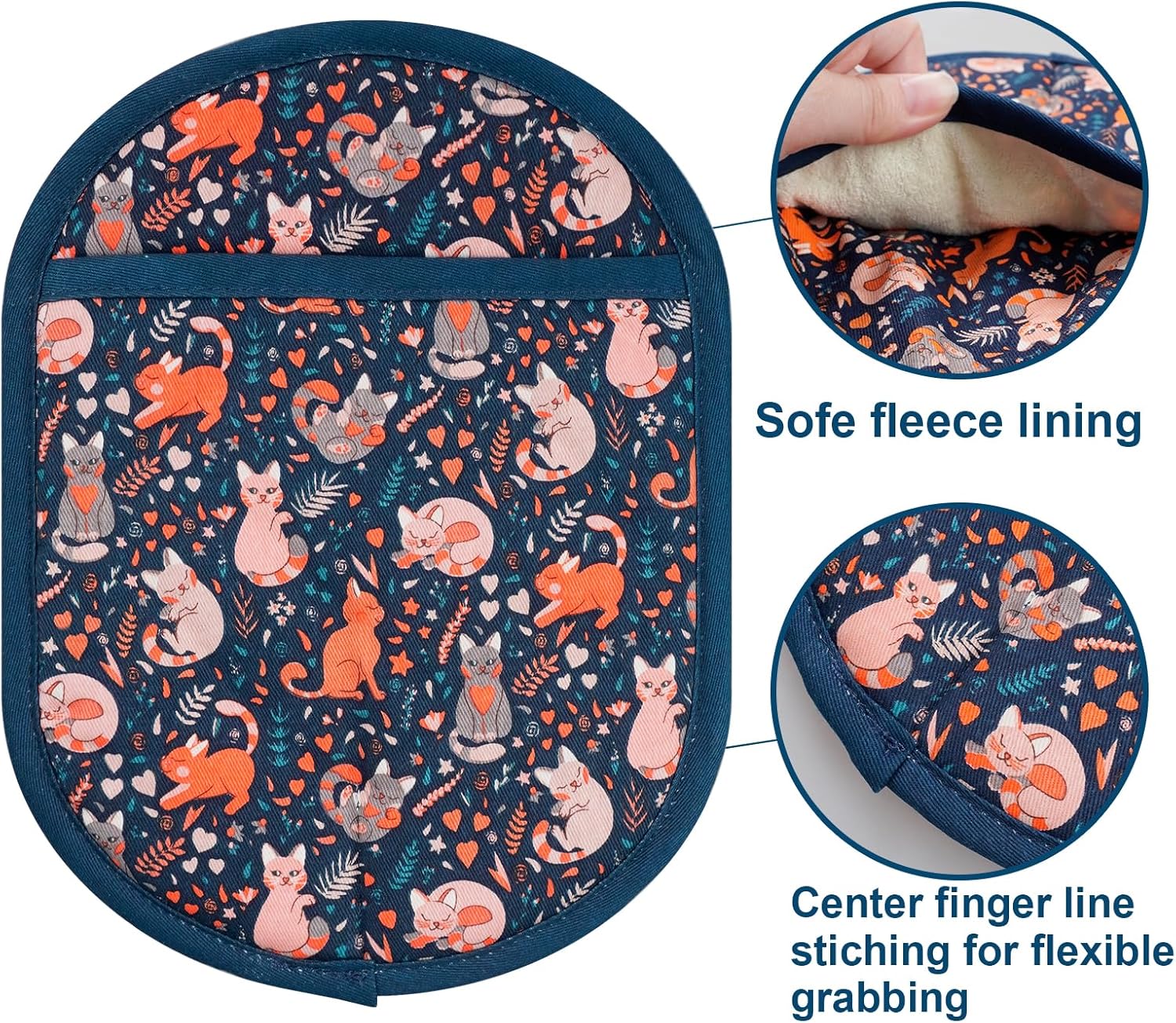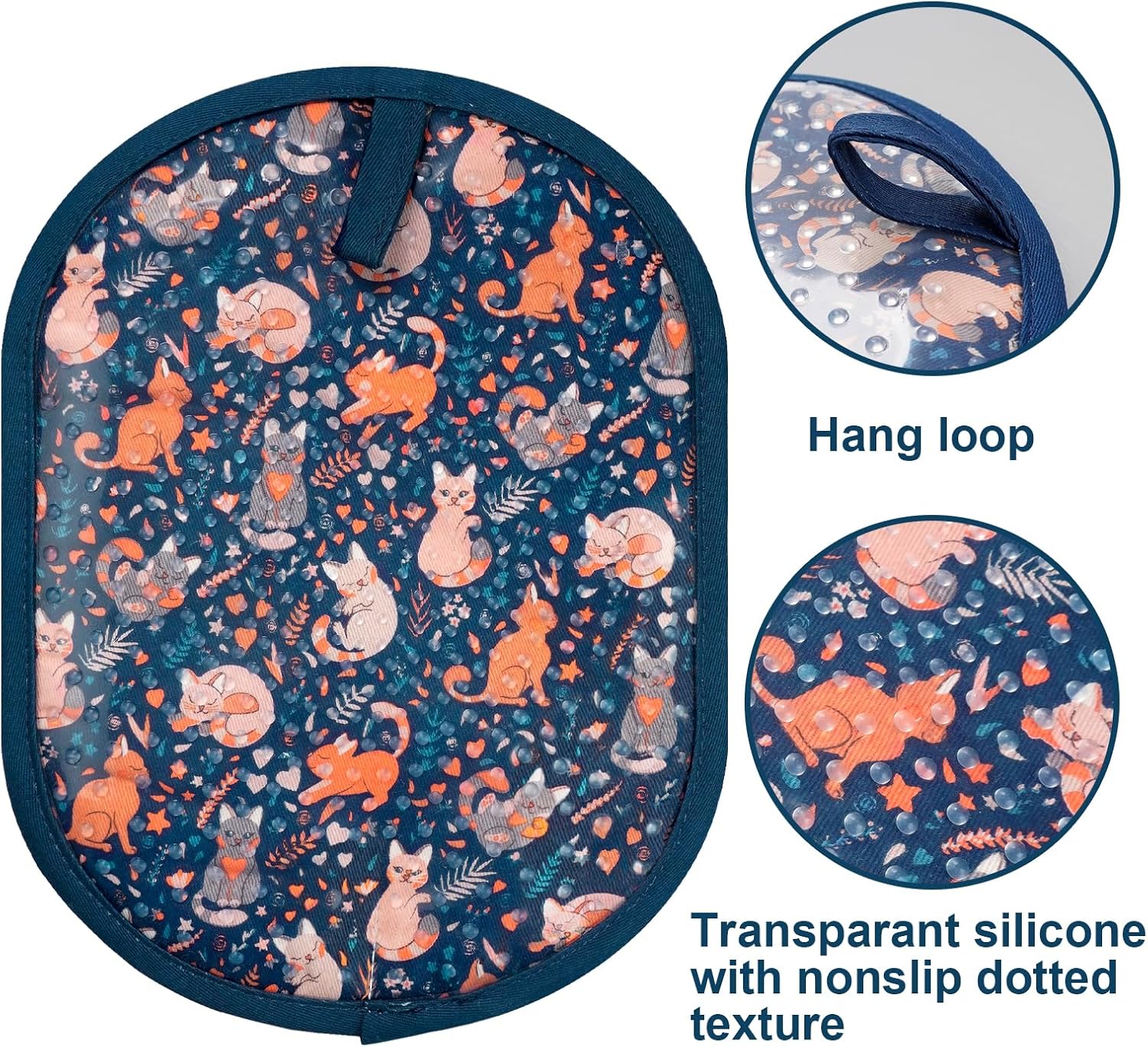 Pot Holders Set of 2 with Transparent Clear Silicone Shell and Nice Cat Flower Cotton Lining, Heat Resistant to 500 F Kitchen Oven Gloves Pot Holder for Cooking (Navy, Cat, Potholders)