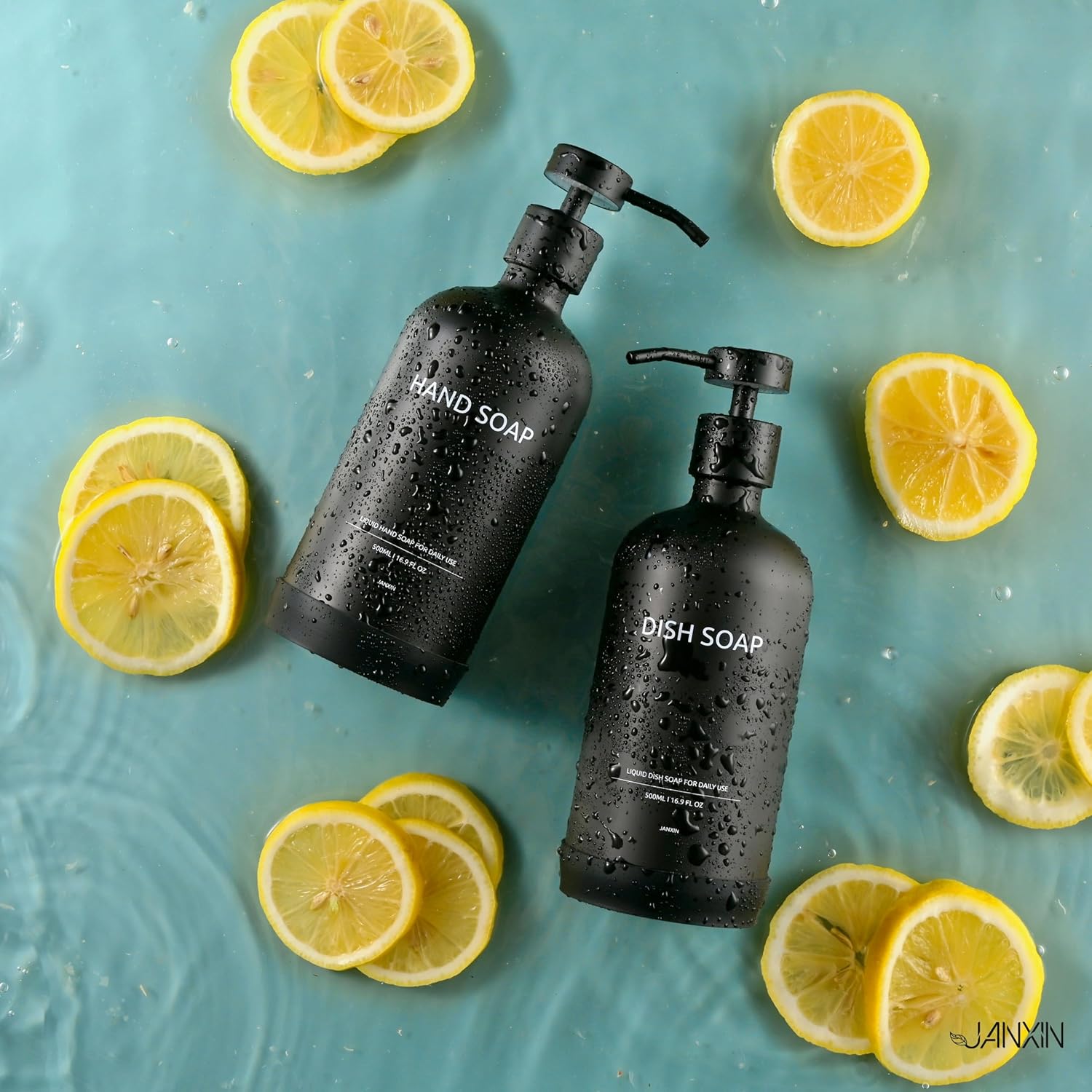 - LUXURY SOAP DISPENSER SET: Transform your kitchen or bathroom decor instantly with our luxurious kitchen soap dispenser set, This set includes two 16.9 OZ/500 premium glass bottles with 2CC stainless steel pumps, two silicone bottom anti-slip pads, one ceramic tray . Great for upgrading your kitchen and bathroom countertops with this stylish soap dispenser set