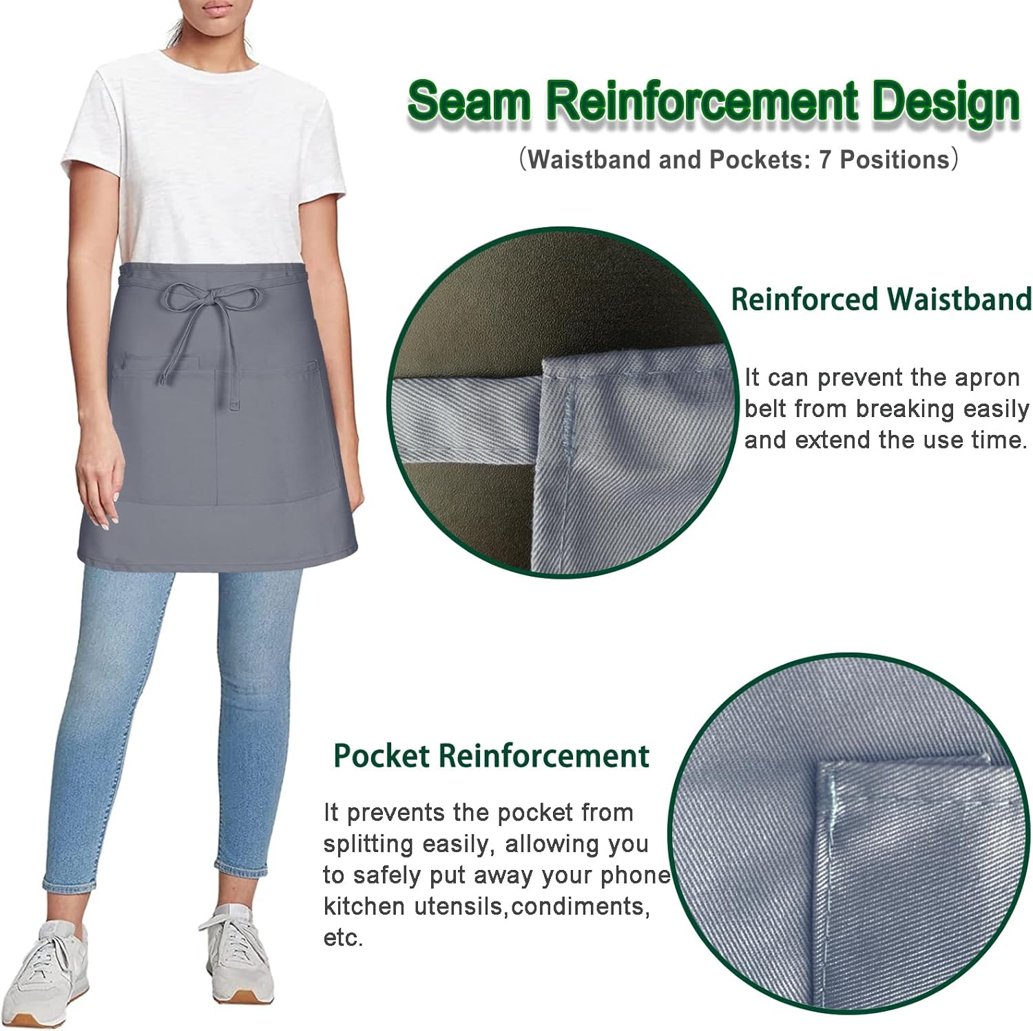 - Excellent Material - The gray servers apron size is L, 15.75'' L * 27.56'' W, made of high quality 20% cotton 80% polyester, thicker and comfortable. Short apron suitable for cleaning, serving, cooking, baking, gardening