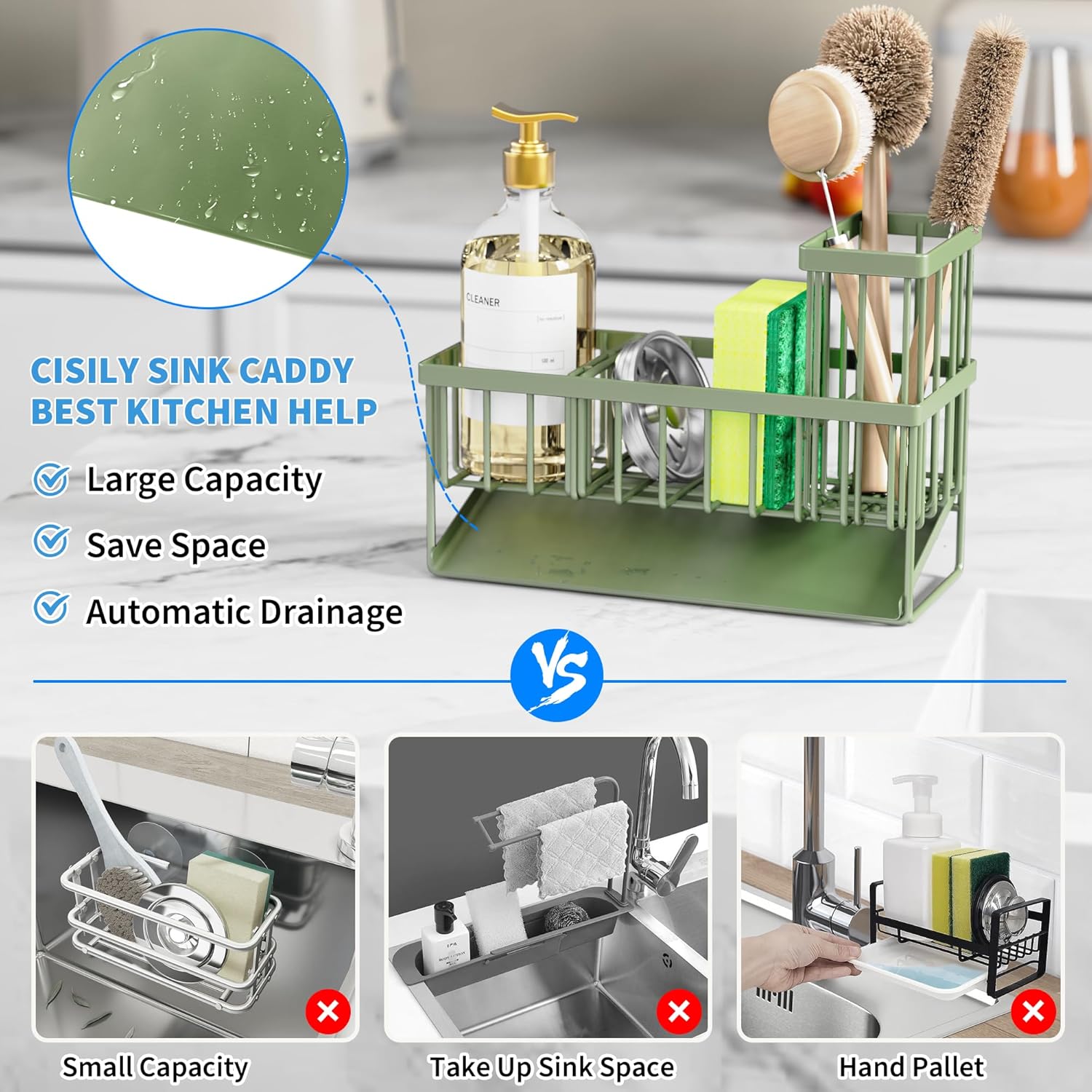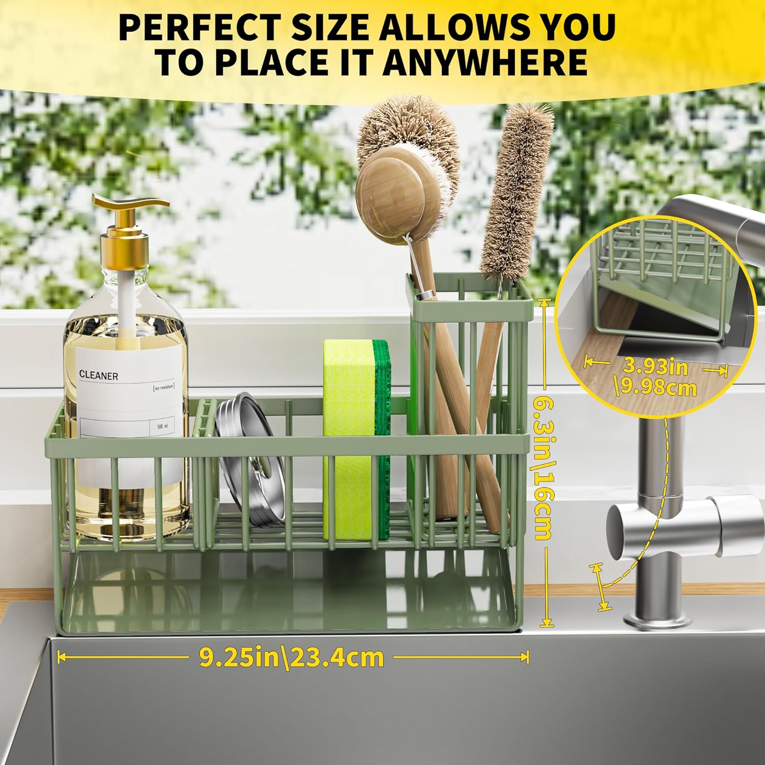 Cisily Kitchen Sink Caddy - Sponge Holder and Organizer with High Brush Holder, 304 Stainless Steel, Sage Green