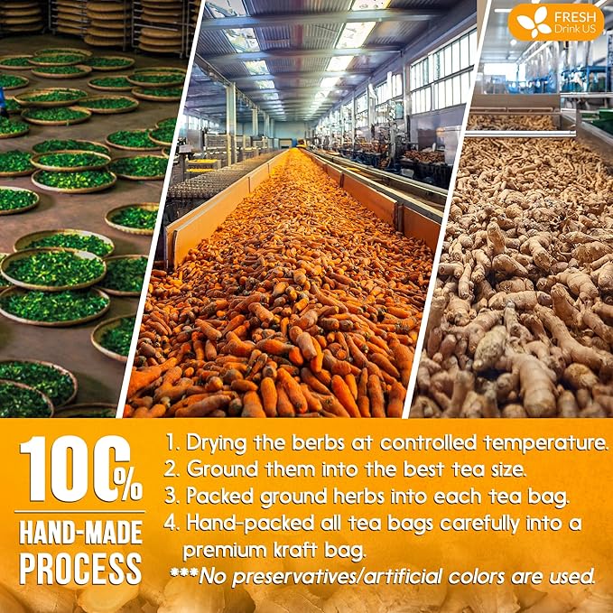 - ☘️ TULSI TURMERIC GINGER TEA BAS MADE BY A HAND-MADE PROCESS: Tulsi Leaves, Turmeric, and Ginger are picked at their flavorful/colorful peak and naturally sun-dried to perfection. We hand-select only the premium herbs for the utmost quality. Then we grind them into the best tea size. Next, we immediately pack it in eco-friendly tea bags. Lastly, we pack the tea bags into food-grade kraft bags for ultimate freshness.