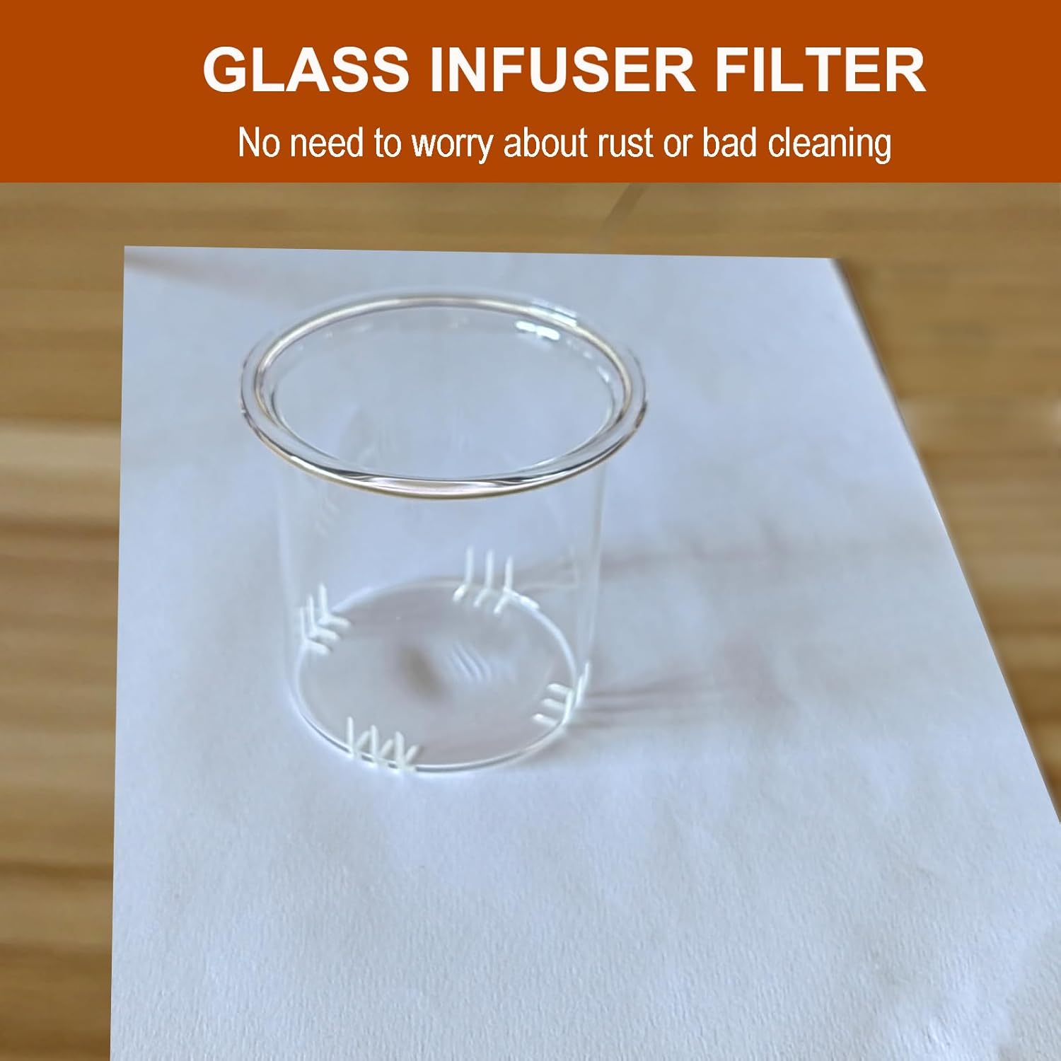 - GLASS INFUSER FILTER: No need to worry about rust or bad cleaning. The glass strainer makes it easy to brew cold and hot tea configurations.
