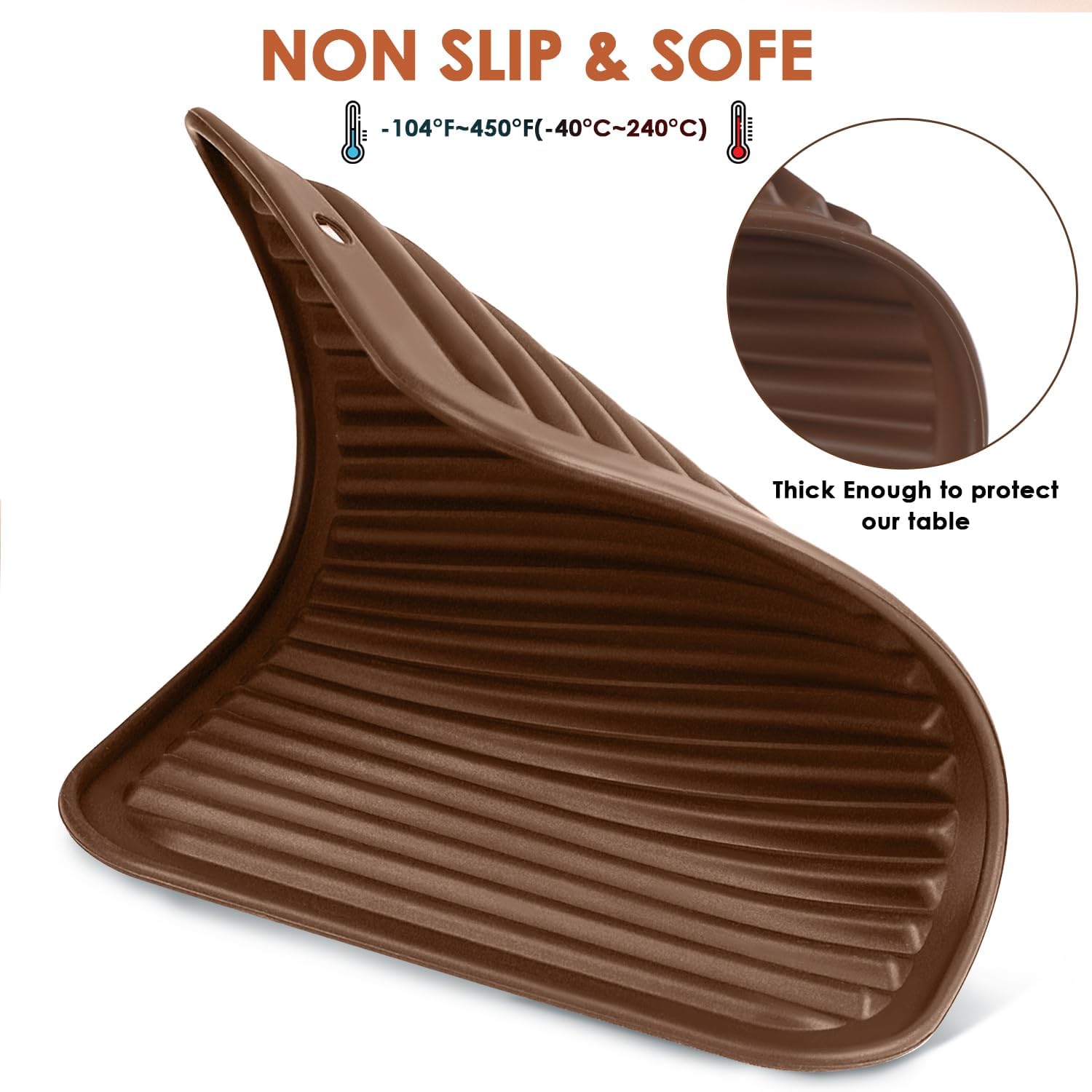 - 🍳【Food Approved Silicone Material Trivet】 Our 9"x12"brown pot holders for kitchen won't stain, crack or chipvery absolutely safe for your health. It's safe to be used in the kitchen, the brown silicone hot pads will not change the color or affect the taste of your food.