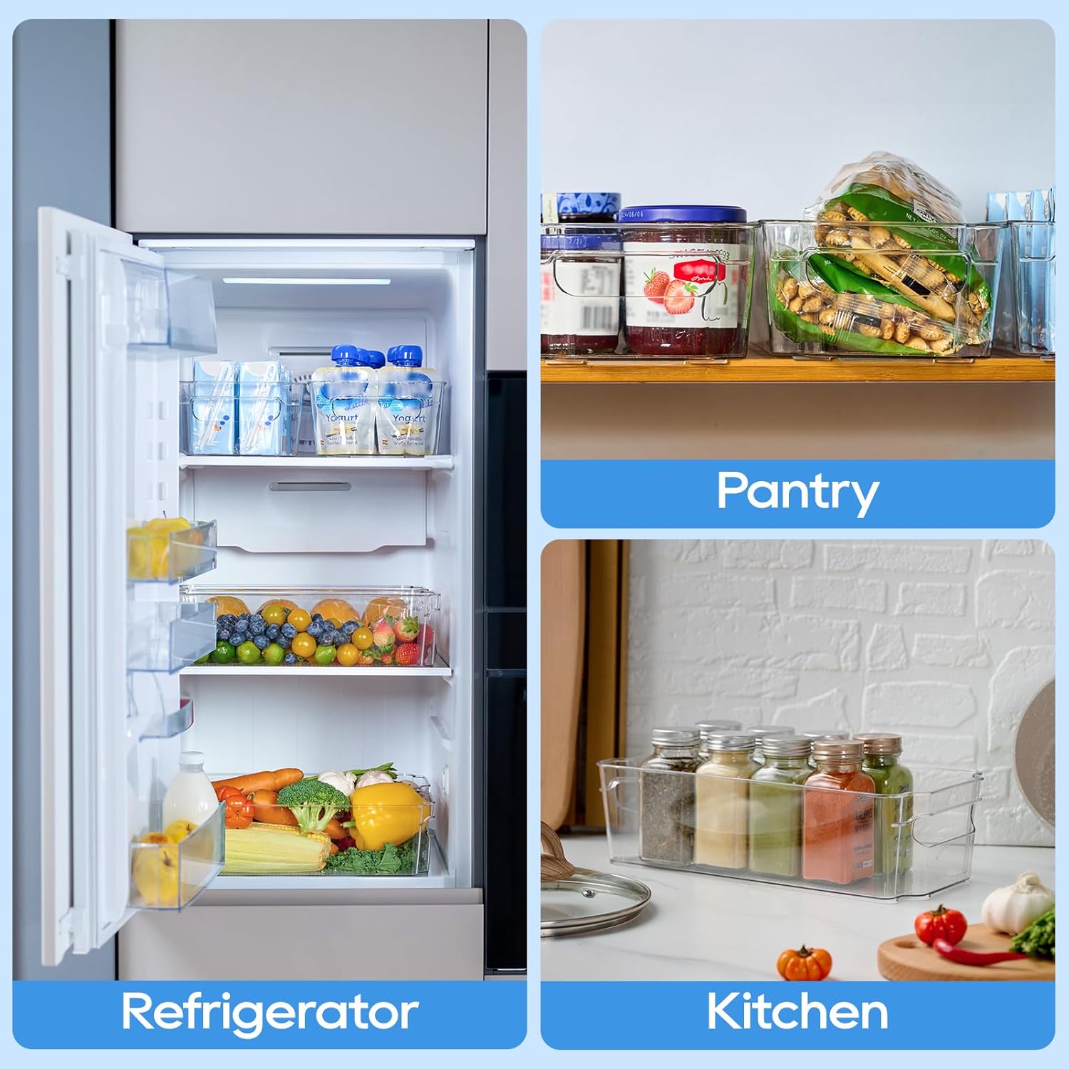 - Transparent Design: With their transparent design, you can easily spot fruits, vegetables, drinks, snacks, and more. These pantry storage bins save time by reducing search efforts, keeping your space tidy and maximizing efficiency