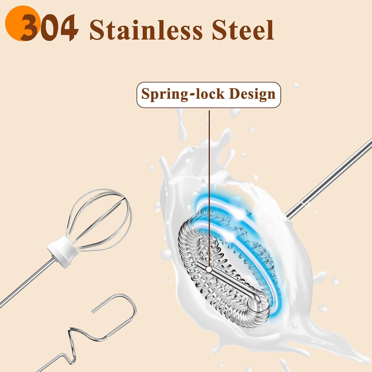 - 3 Whisk Attachments: This electric stirrer comes with 3 detachable whisk heads—the spring whisk for creamy froths, the balloon whisk for whipping and mixing, and the hook whisk for stirring and blending. Made from durable 304 stainless steel, it’s easy to clean with a simple rinse or wipe, keeping your coffee frother ready for the next use