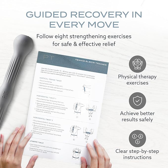 - COMPLETE INSTRUCTIONS PROVIDE COMPREHENSIVE MUSCLE TRAINING: The PT Pro Tennis Elbow Trainer comes with detailed illustrated instructions for exercises that address multiple muscles in hands, wrists, arms, elbows, and forearms. Eliminate pain and increase strength and flexibility for all sports that rely on the forearm.