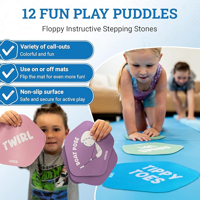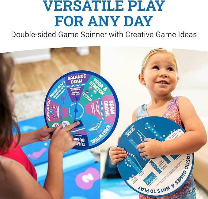 - PERFECT TOOL FOR CREATIVITY: Gibson Engage Gymnastics Games are built with versatility in mind, making this set ideal for promoting imaginative creative play. Crafted from premium materials, the tumbling and gymnastics playset can be set up with mats and beam end-to-end, or with beam between the mats. Colorful graphics inspire "jumping over water", "avoiding the lava", hopscotch, cartwheels, tumbling, and countless configurations with the puddles as stepping stones. Every part of the set, from the two-sided spinner to the puddles and mats, gives suggestions for endless play and exercise.