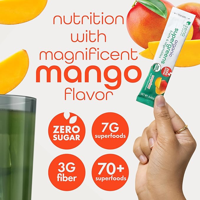 Zena Nutrition Organic Super Greens Powder, 70+ Superfoods, 0 Sugar, 3G Fiber, Spirulina, Chlorella, Antioxidants, Prebiotics/Probiotics, Digestive Enzymes, Mango, 30 Drink Mix Packets