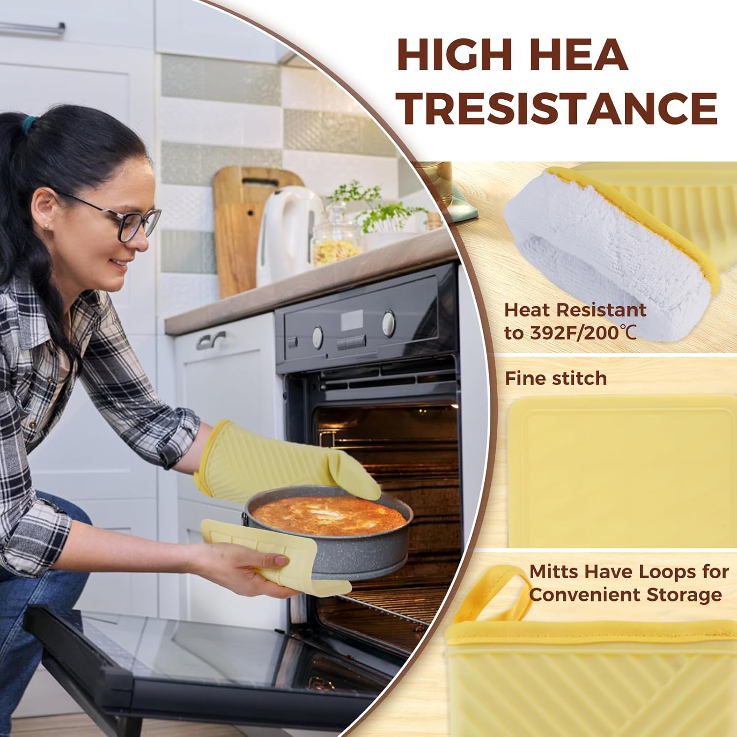 Set of 4 Oven Mitts and Pot Holder Heavy and Tall Kitchen Cotton Gloves Lined Towelcloth, Gloves Length 40cm, Pot Holder Width 20cm Diameter Round… (Yellow Silicone)