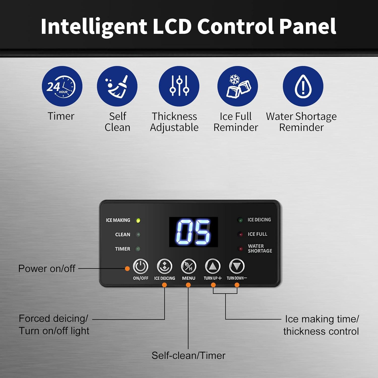 - ❄【Smart LCD Panel】Our commercial ice maker machine is equipped with a multi-function LCD panel, smart and easy to operate. A variety of functions to meet your needs of the ice machine, such as Ice Full Reminder, Ice Cube Thickness Option, Timer, Water Shortage Reminder, Auto-clean, etc.