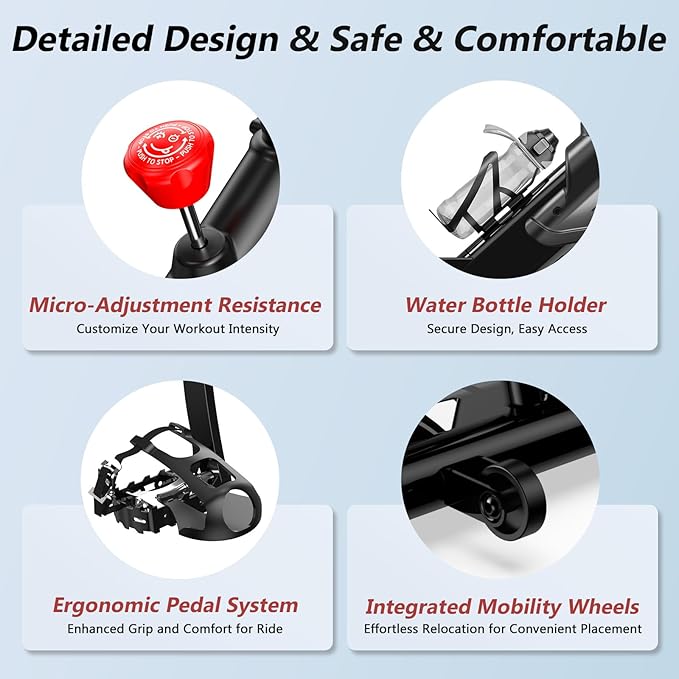 - 【Hyper-Quiet Drive System】We developed the latest technology eliminates noise to our fitness bike, controlling the sound at 20 dB even after millions of times workout. No disturbing on working, reading, and sleeping at home.