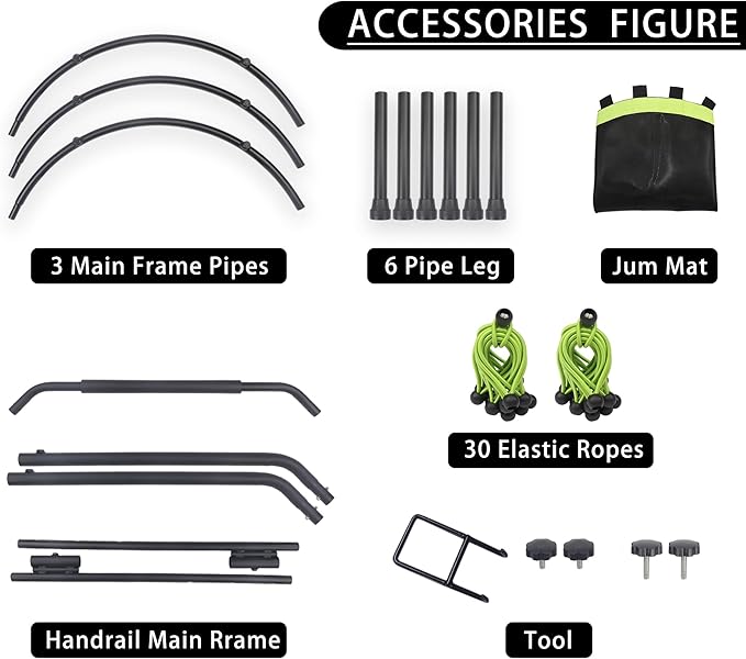 - ✅【Good Elasticity】:The bungee-rope design system with 30 thickened ropes which are 0.32"(8MM) of diameter provides joint-friendly suspension,soft but strong bounce back, provides silent and safely bounce back, reduces noise in maximum extent, affords more stability, and gives you a great jumping experience. Special tool is included for assembly.