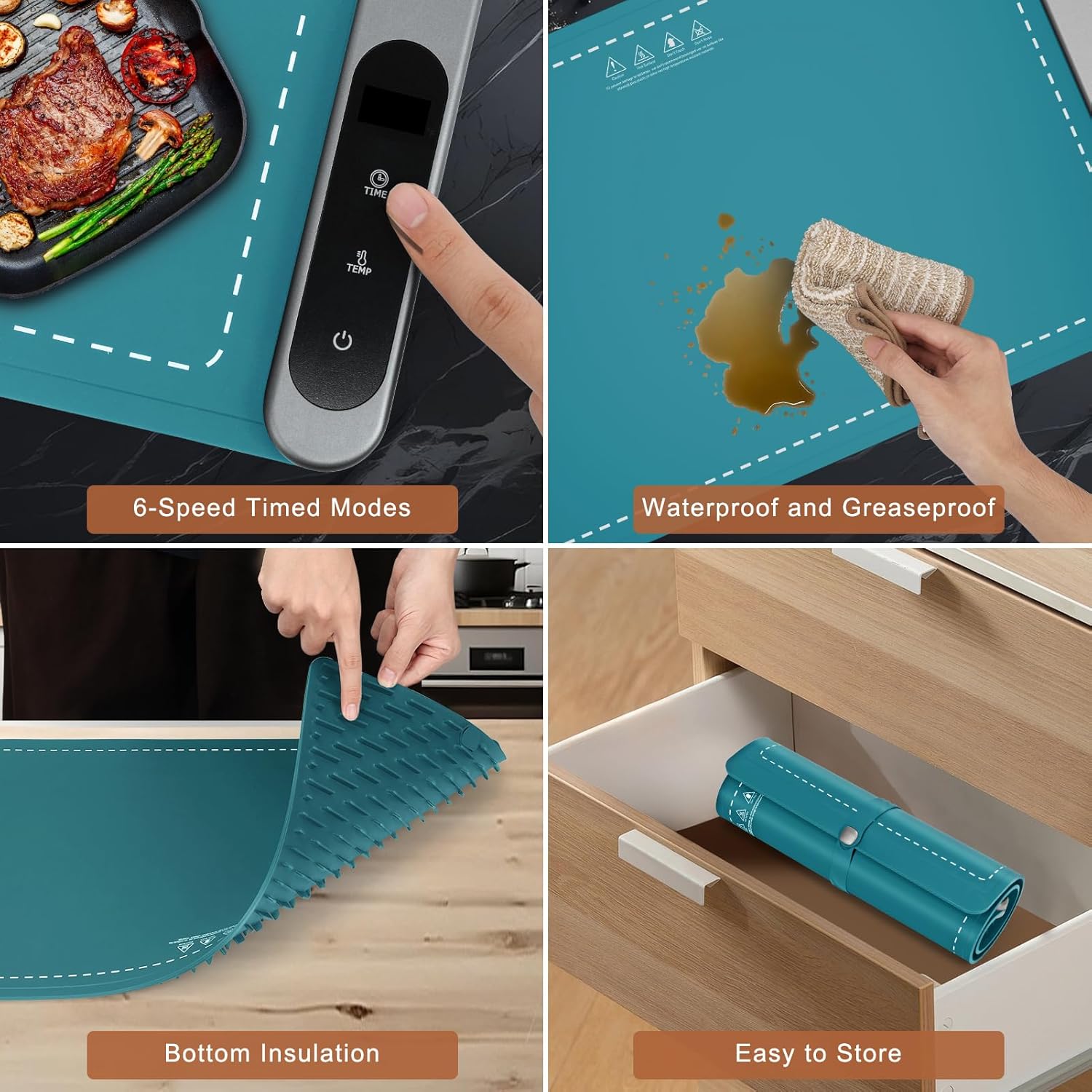 - Premium Silicone Nano Material: Our electric warming tray is made of premium flexible silicone nano material, which is splash-proof, stain-proof and oil-proof, combining durability and practicality. It can be folded and stored without creases, guaranteeing long-lasting use.