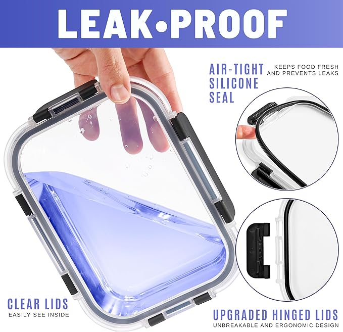- Keeps Food Fresh and Secure: Each storage container for food features a four-sided locking lid with an airtight silicone seal to preserve freshness and prevent leaks. Glass containers for food storage stack easily in the refrigerator, freezer, or cabinet.