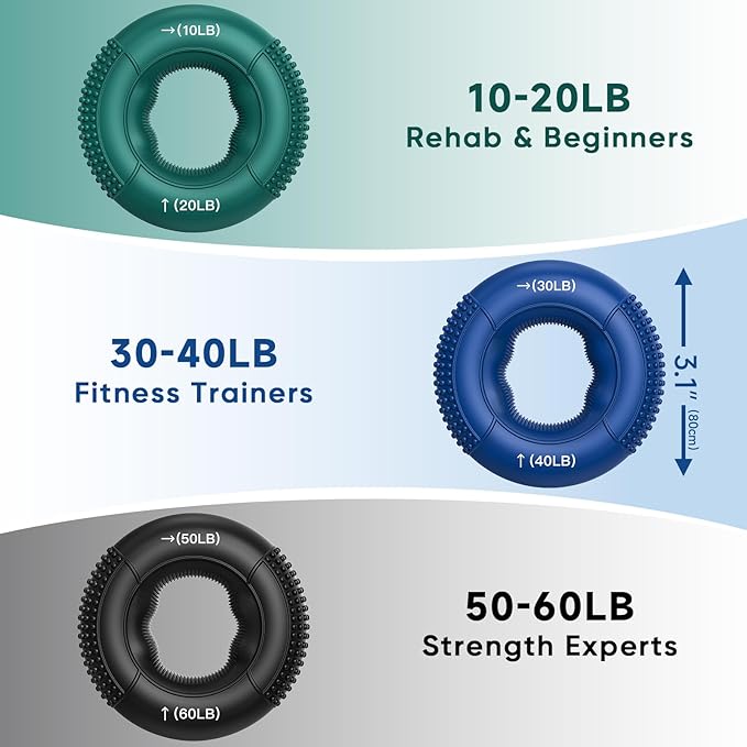 - ๐ฃ๐ฟ๐ผ๐ด๐ฟ๐ฒ๐๐๐ถ๐๐ฒ ๐ฅ๐ฒ๐๐ถ๐๐๐ฎ๐ป๐ฐ๐ฒ ๐ณ๐ผ๐ฟ ๐๐๐ฒ๐ฟ๐ ๐๐ฒ๐๐ฒ๐น: Three stress balls for adults (Soft, Medium, Hard) and three grip rings (10โ60LB) provide a gradual path for growth. Whether you're recovering from injury, just starting out, or training hard, thereโs a resistance that fits your needs.