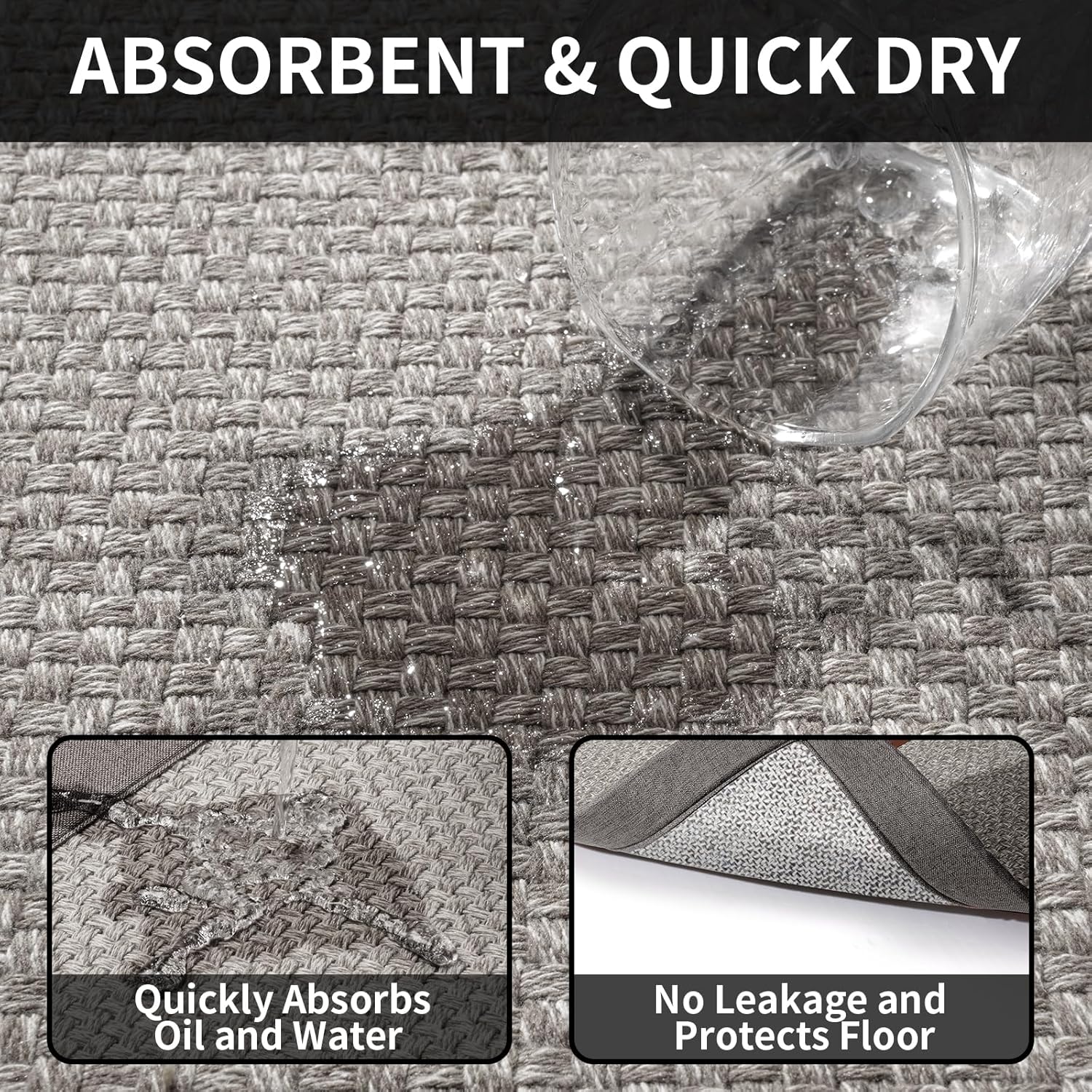 - Super Absorbent Quick Drying Kitchen Rugs - This water absorbent kitchen rugs with a woven surface absorbs dripping oil and water, making it easy to handle spills and moisture. Good water absorption and stain resistance protects the floor from grease, moisture, sauces or food particles, keeping the kitchen tidy and adding an extra layer of safety to the kitchen.
