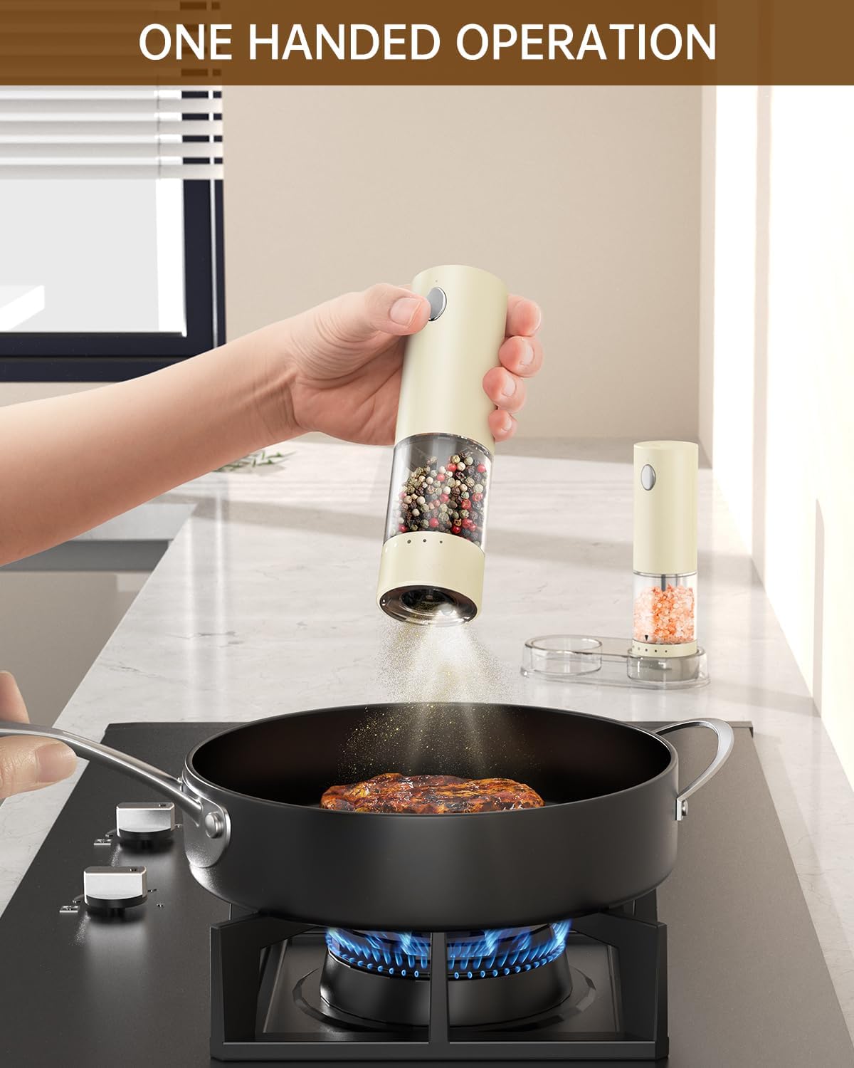 - ✔️ONE-HANDED OPERATION - With a simple press of the button, this rechargeable electric pepper grinder set offers effortless and user-friendly operation, allowing you to season your dishes with just one hand. The electric salt and pepper grinder set includes a transparent storage base to keep your grinders organized and your kitchen countertop tidy