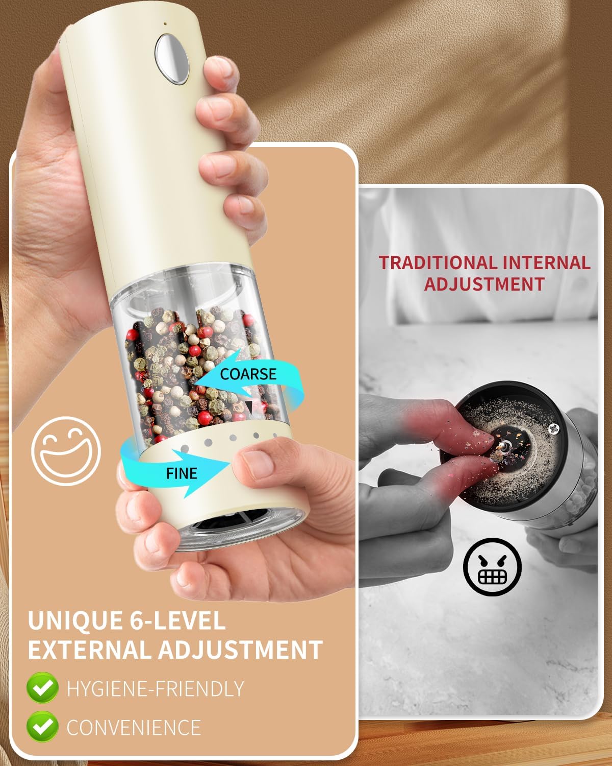 - ✔️ADJUSTABLE COARSENESS - This automatic salt and pepper grinder can meet your grinding needs. Easily adjust the core to achieve the perfect coarseness for grinding salt, pepper, or any other seasoning of your choice. The pepper grinder set is made of a high-quality ceramic grinding core to help you retain the original flavor of the spices