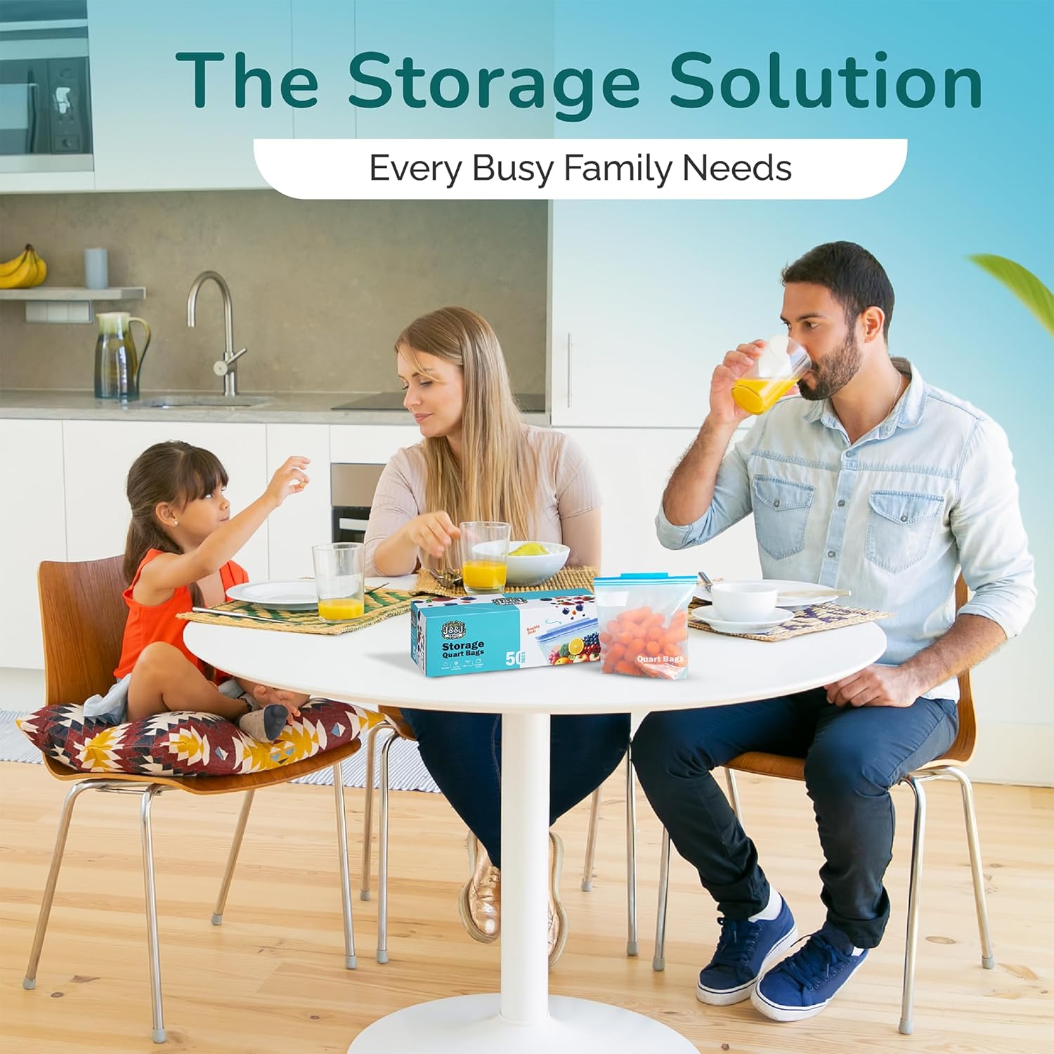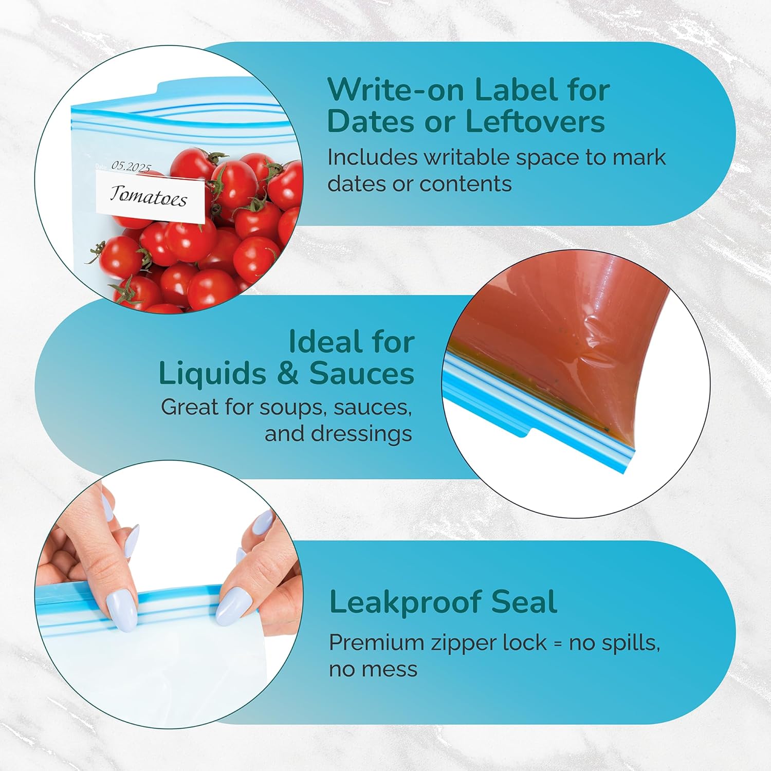 J&&J Fresh Storage Quart Freezer Bags, 50 Pack ā Reusable, BPA-Free, Leakproof ā Expandable Bottom, Microwave-Safe, Strong Zipper Seal ā Quart Bags for Meal Prep & Freezer Storage ā Durable & Washable